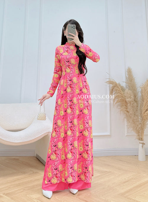 Lucky Pink Tết Blossom Vietnamese Traditional Ao Dai M6