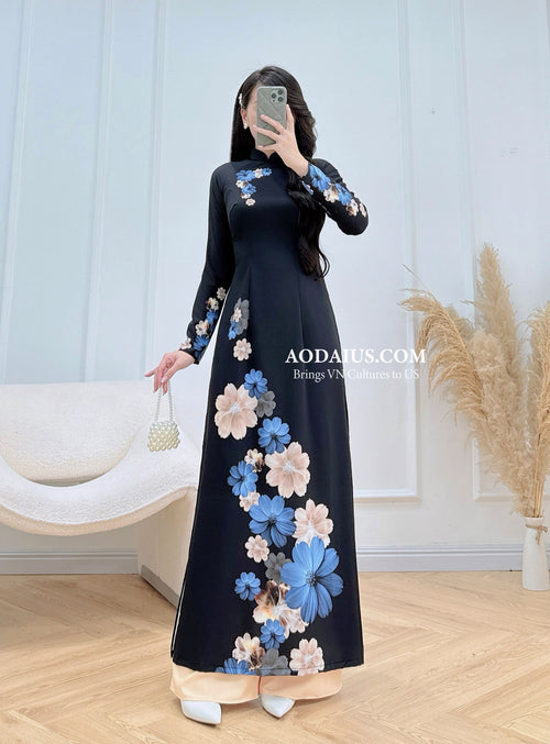 Black Daisy Elegance Vietnamese Traditional Ao Dai H14