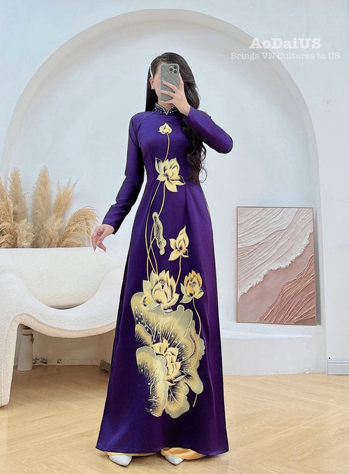 Embroidered Lotus Crystal & Pearl Áo Dài | Traditional Vietnamese Ao Dai E17