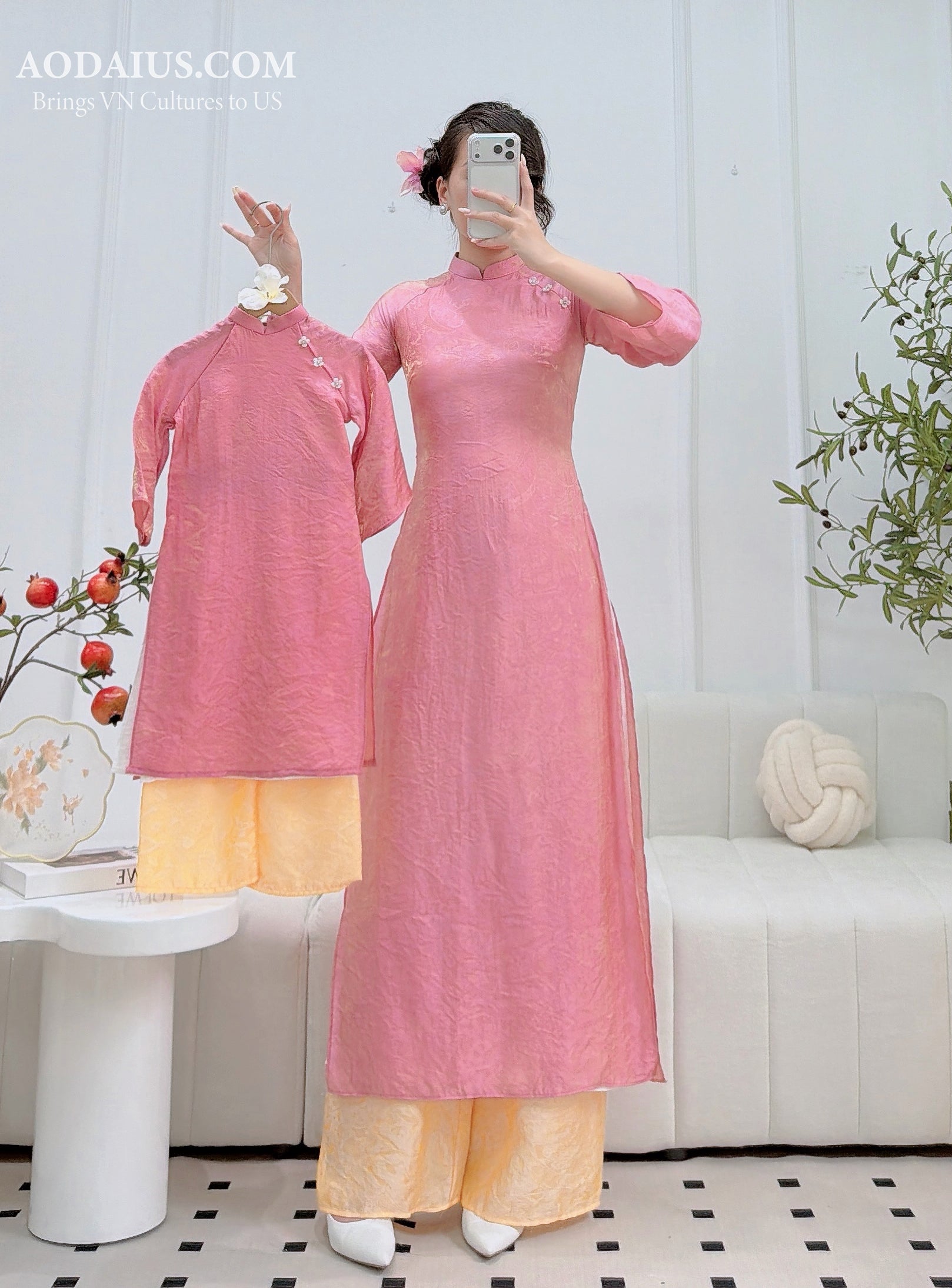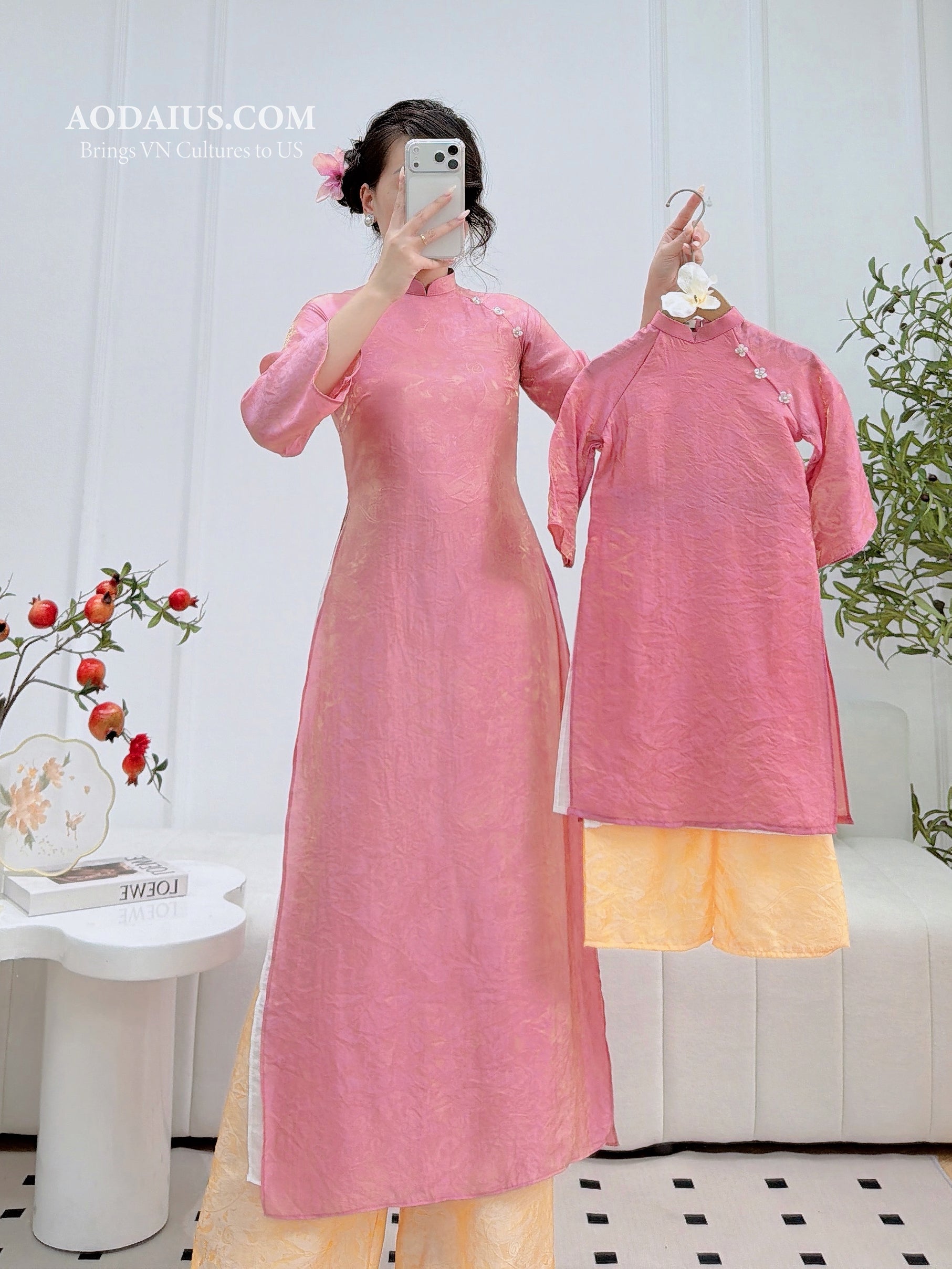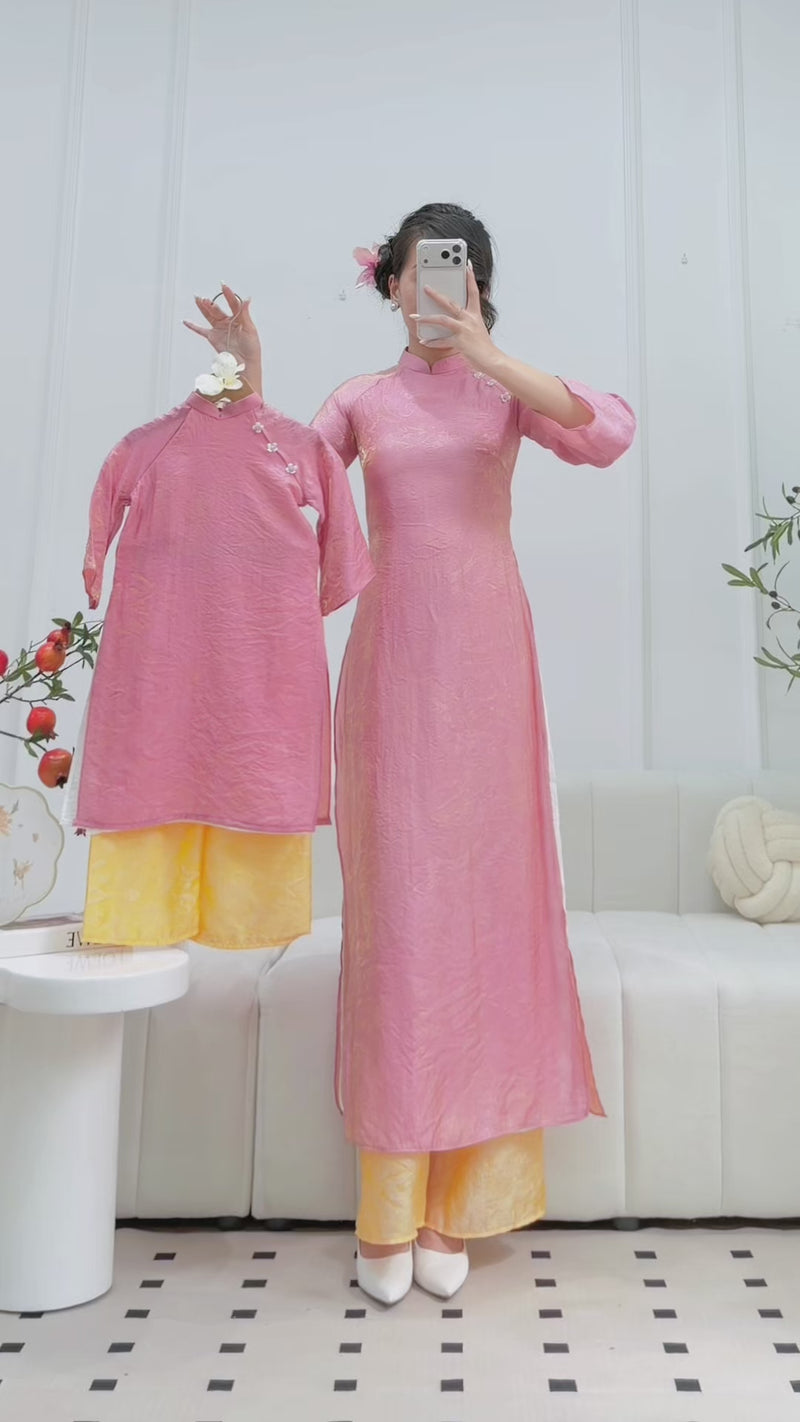 Pink Mother & Daughter Matching Modern Ao Dai Set | 2-Layer Vietnamese Dress O10