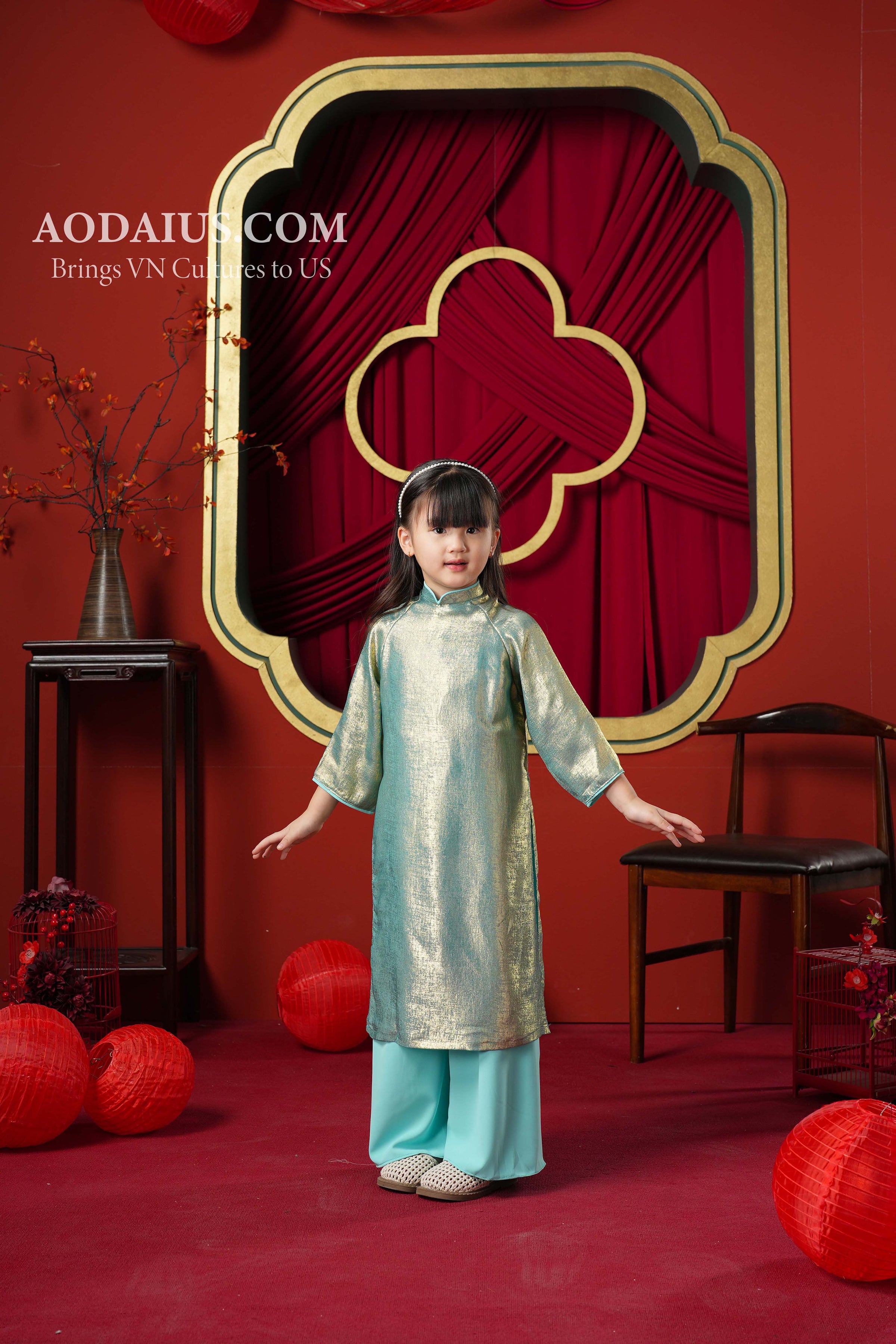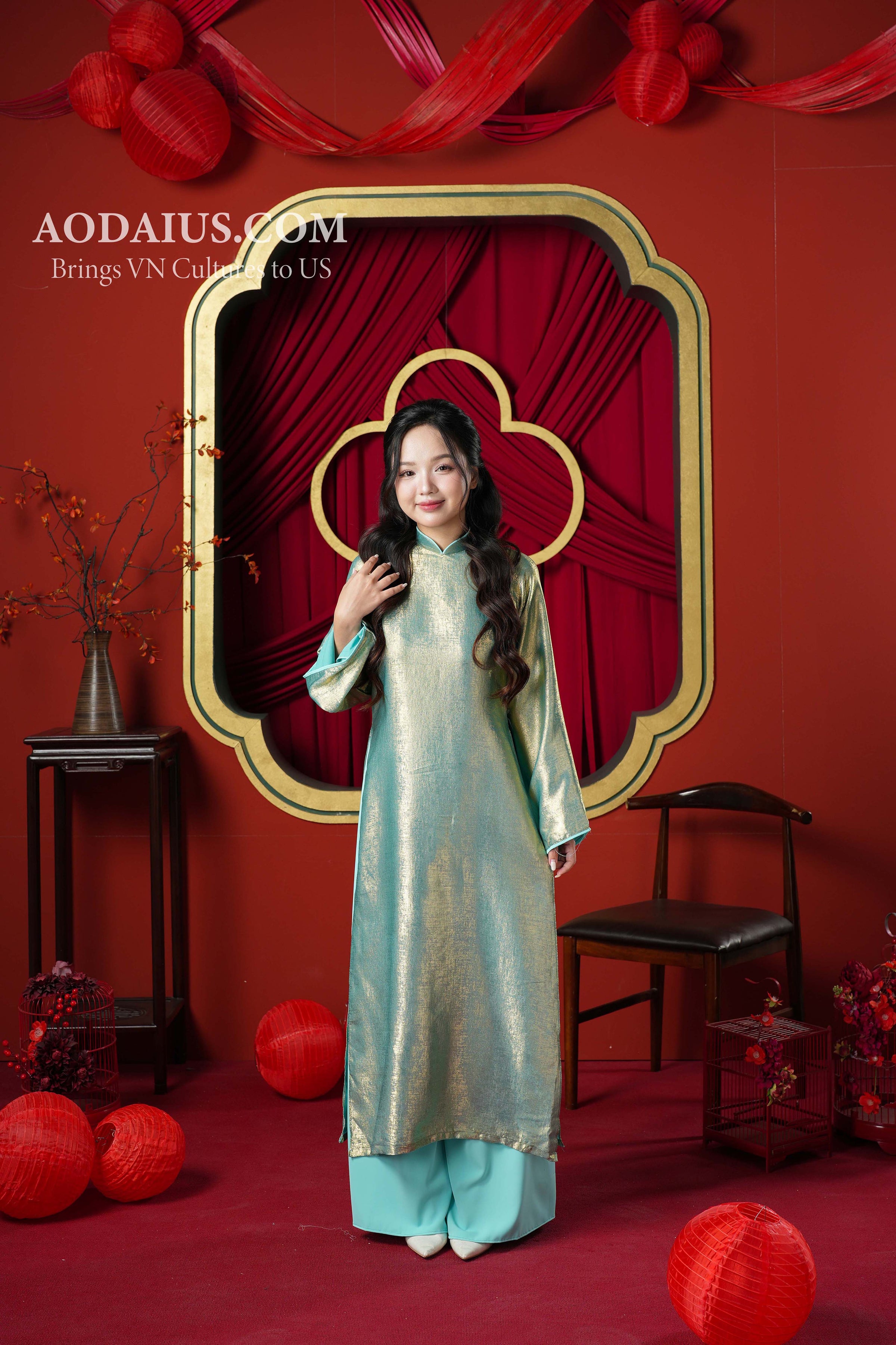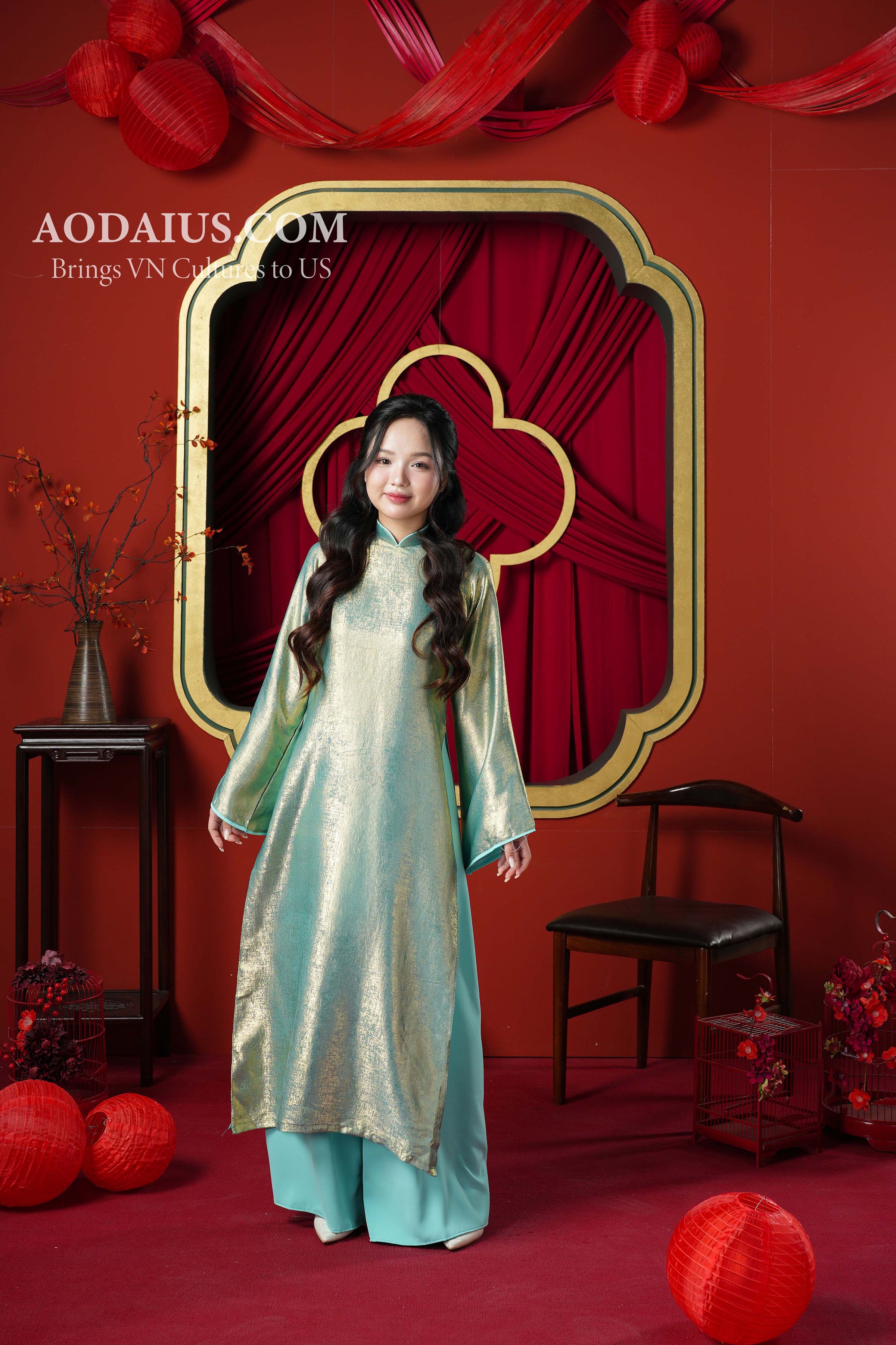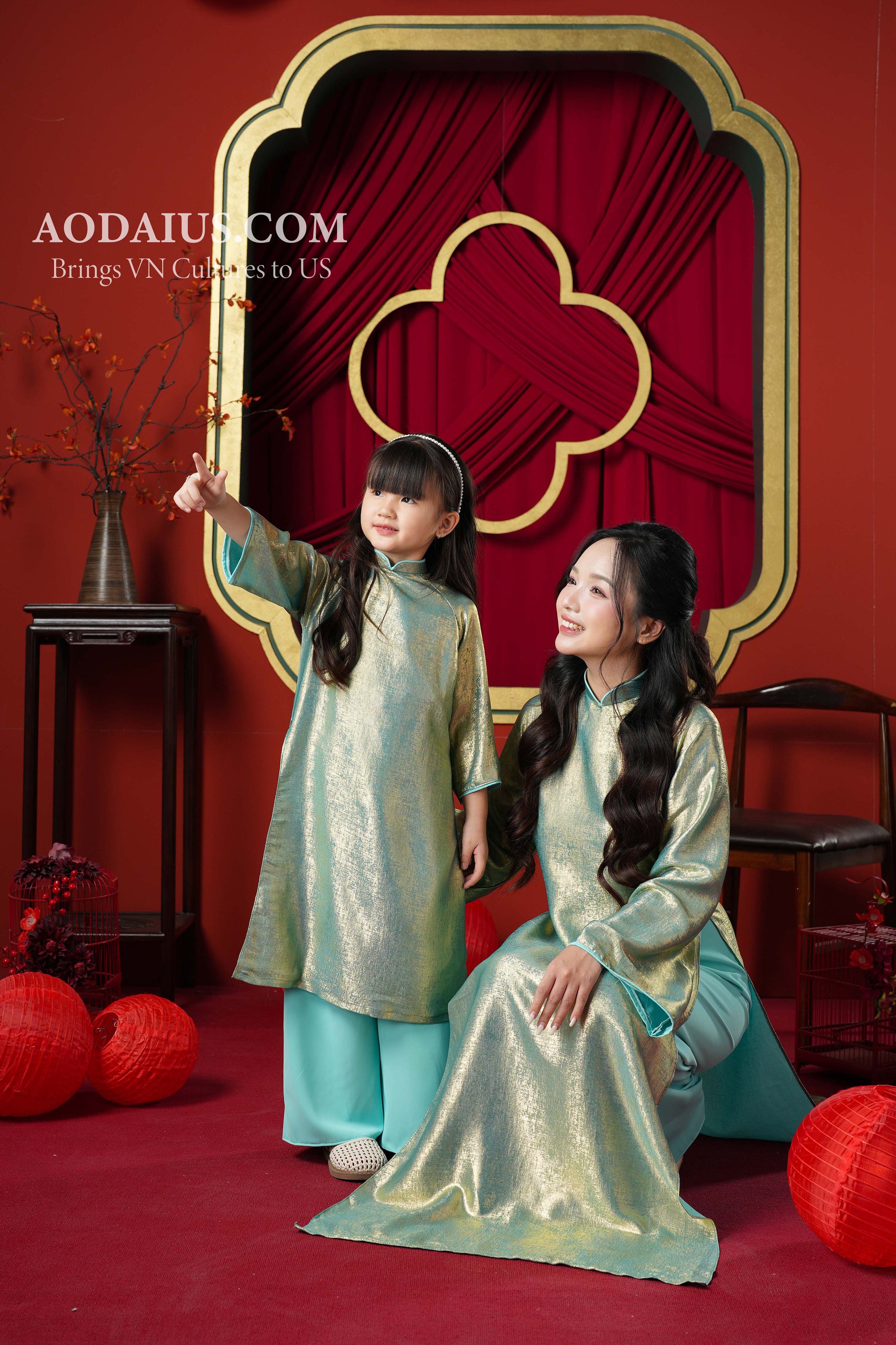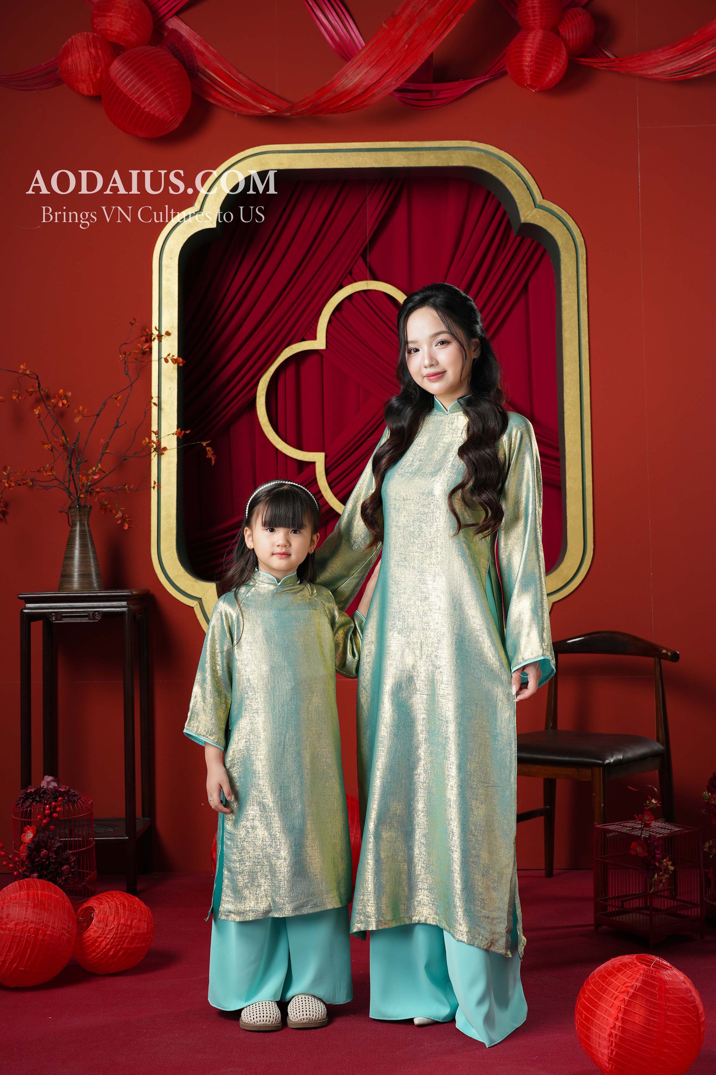 Bring a modern sparkle to Tết with this elegant matching mother–daughter Áo Dài set in soft jade. The long tunic is made from a shimmering, Kim Sa fabric that catches the light beautifully, lined with a smooth jade layer for comfort.
