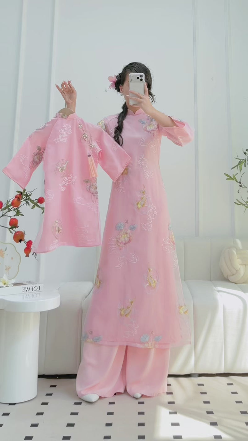 Celebrate Tết in soft, graceful style with this Pink Mother & Daughter Matching Vietnamese Áo Dài Set. Made from embroidered sheer fabric (tơ thêu), the set features delicate traditional-inspired motifs that feel sweet, elegant, and photo-ready. The classic high collar and flowing silhouette make it perfect for Lunar New Year, family photos, weddings, church, and cultural events.