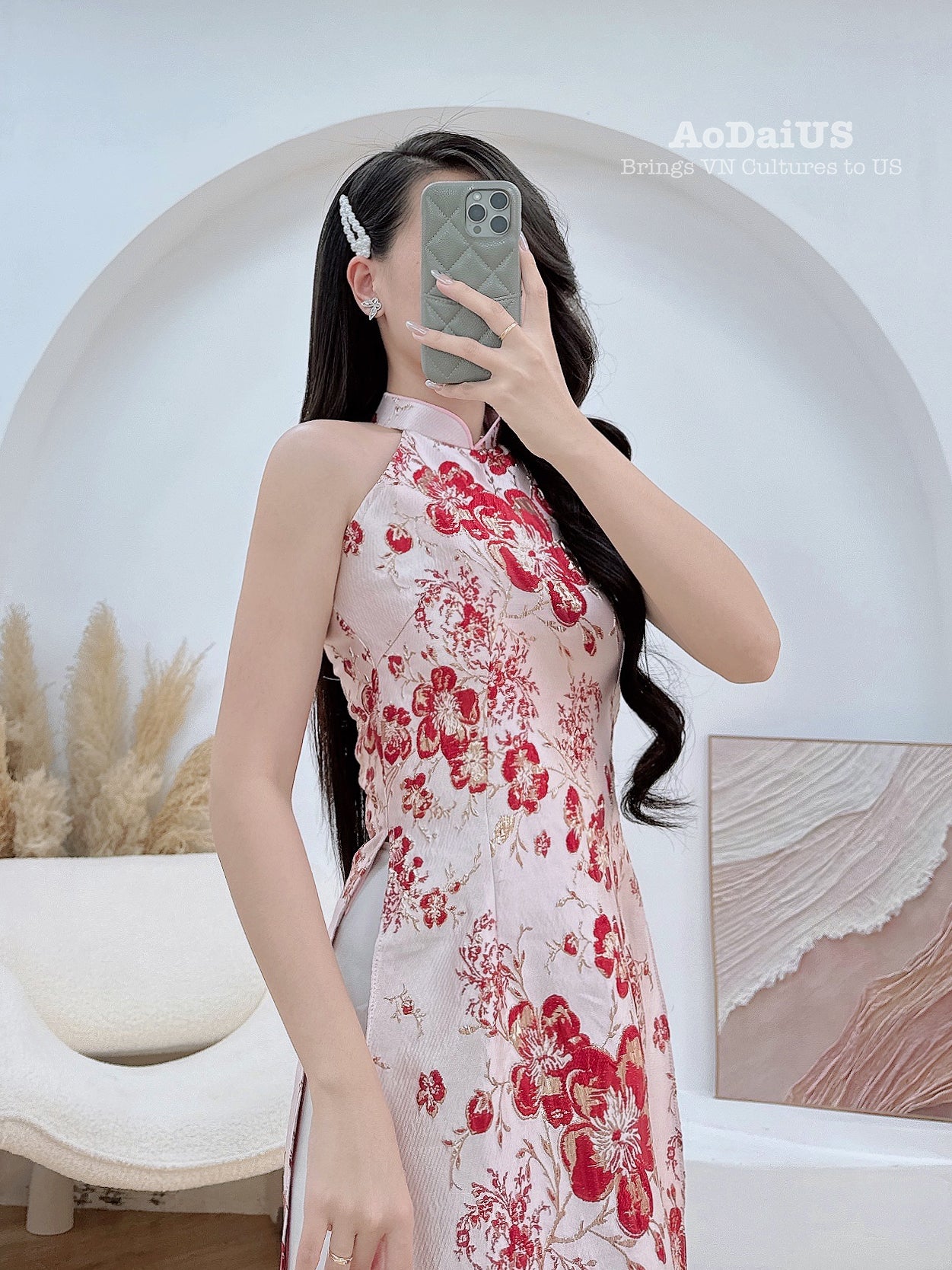 Bring a soft, romantic glow to any occasion with this modern yếm-style áo dài.