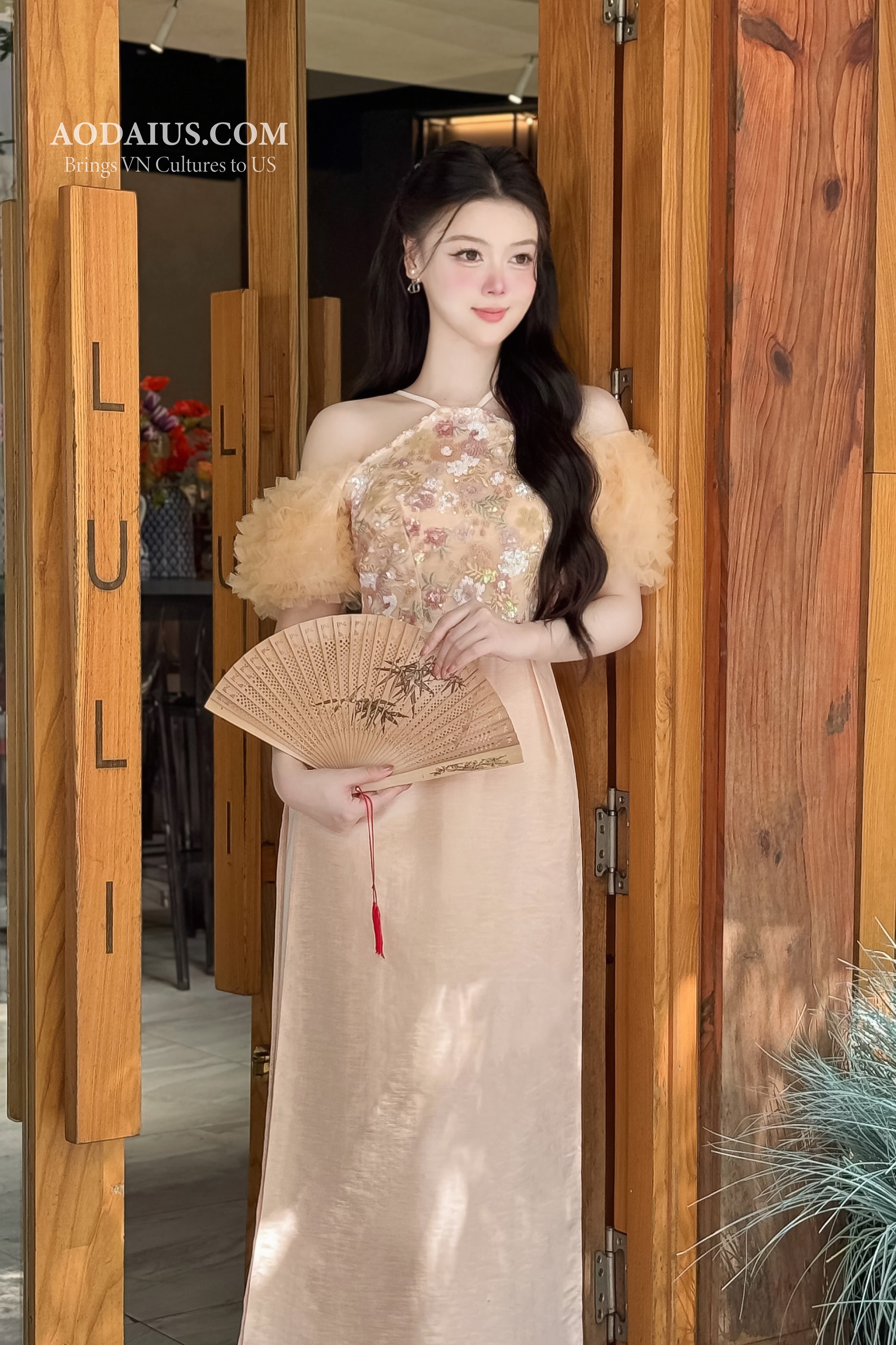 Beige Halter Off Shoulder Ao Dai Top | Modern Vietnamese Dress O26