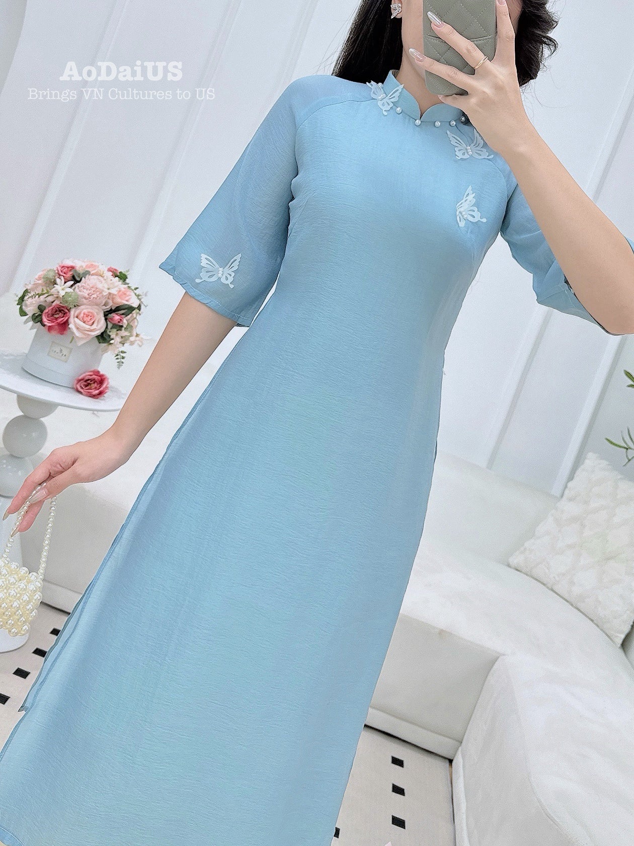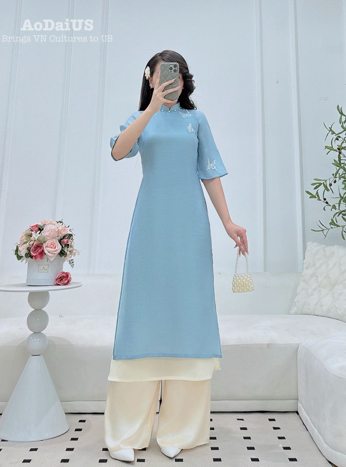 This plain blue Áo Dài is crafted from lightweight crêpe silk, giving it a soft and graceful drape. The design is elevated with hand-applied butterfly embroidery and delicate pearls around the neckline, adding a touch of elegance and femininity.