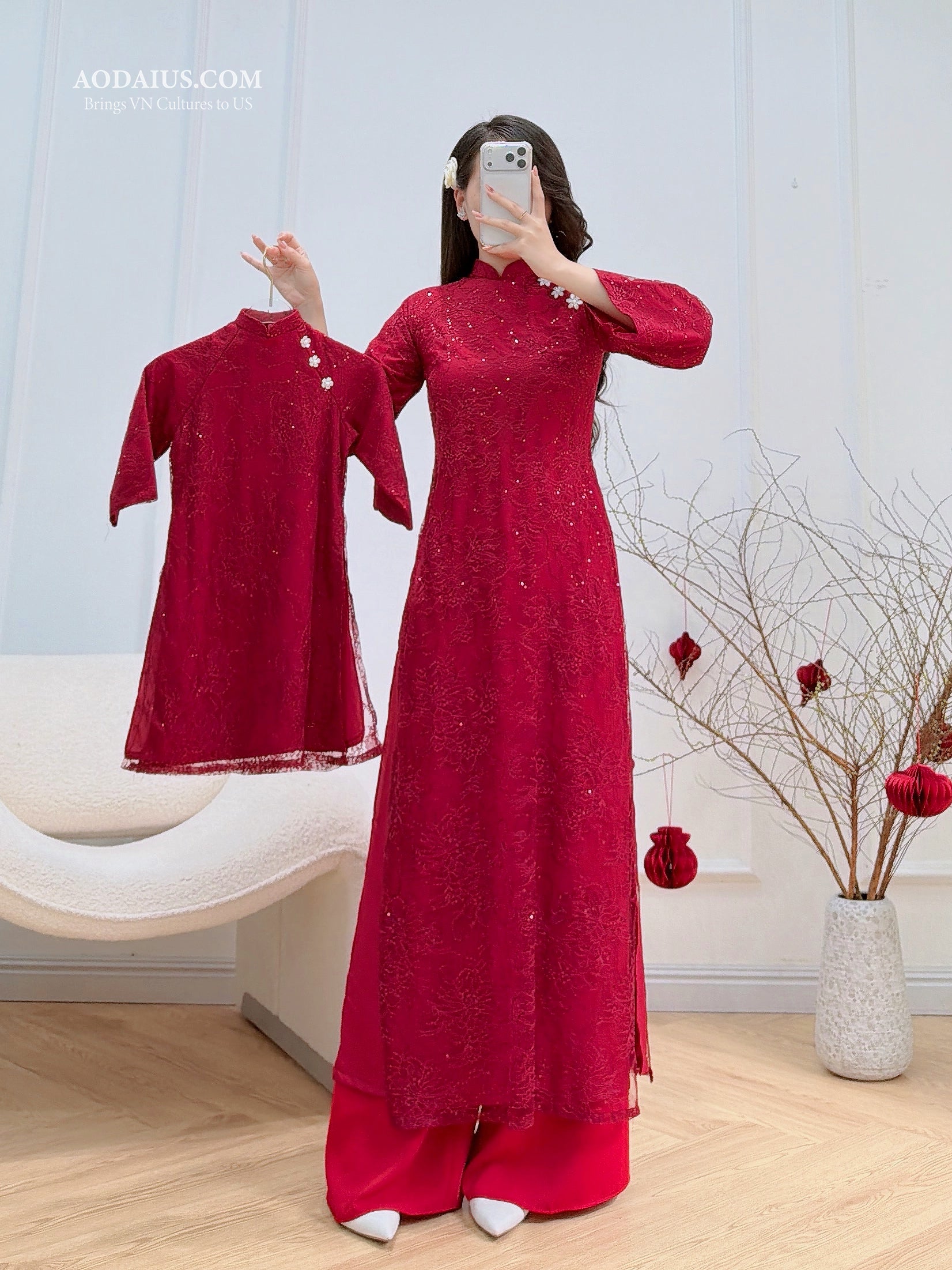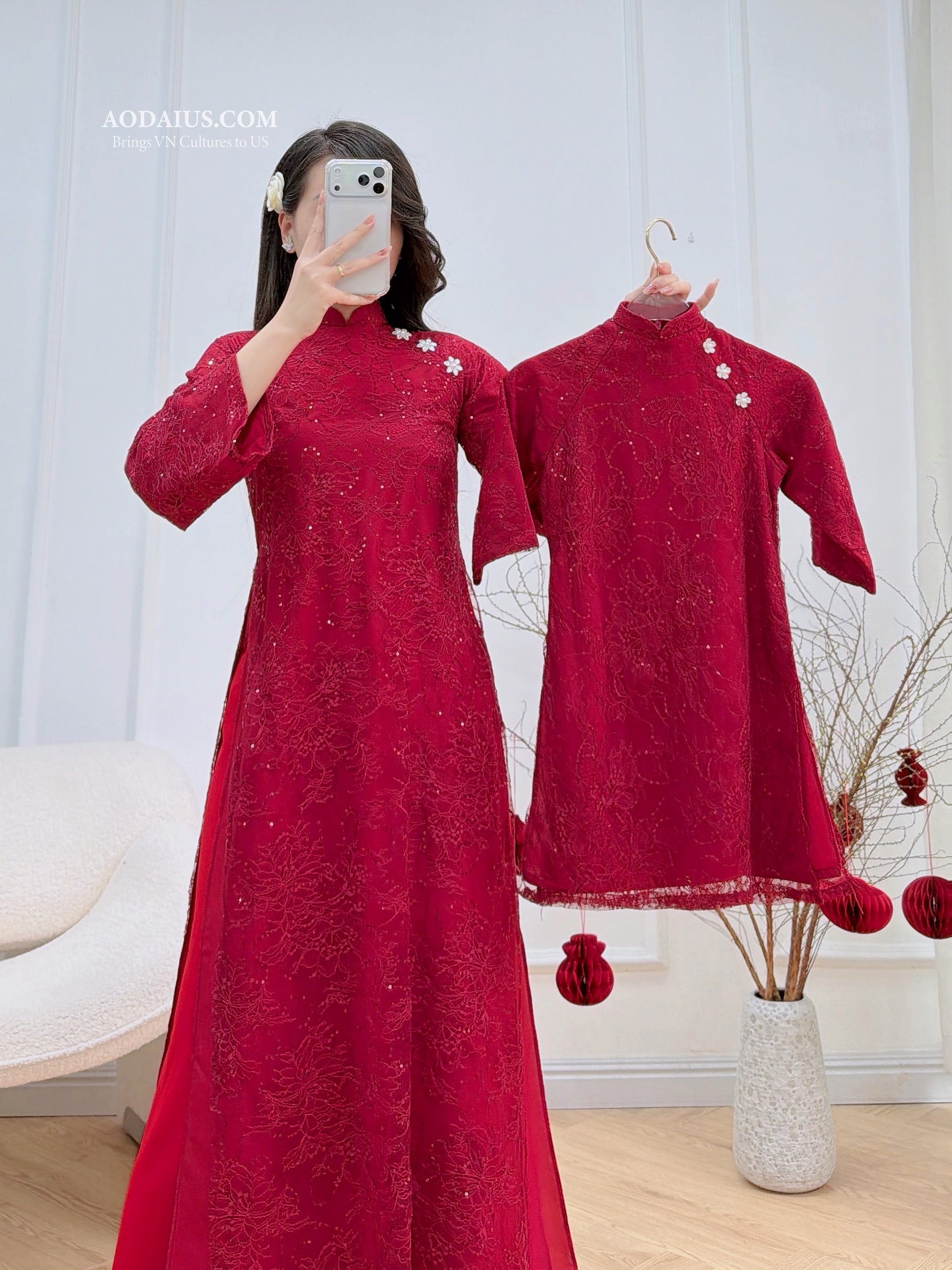 Red Floral Mother Daughter Matching Vietnamese Ao Dai O8