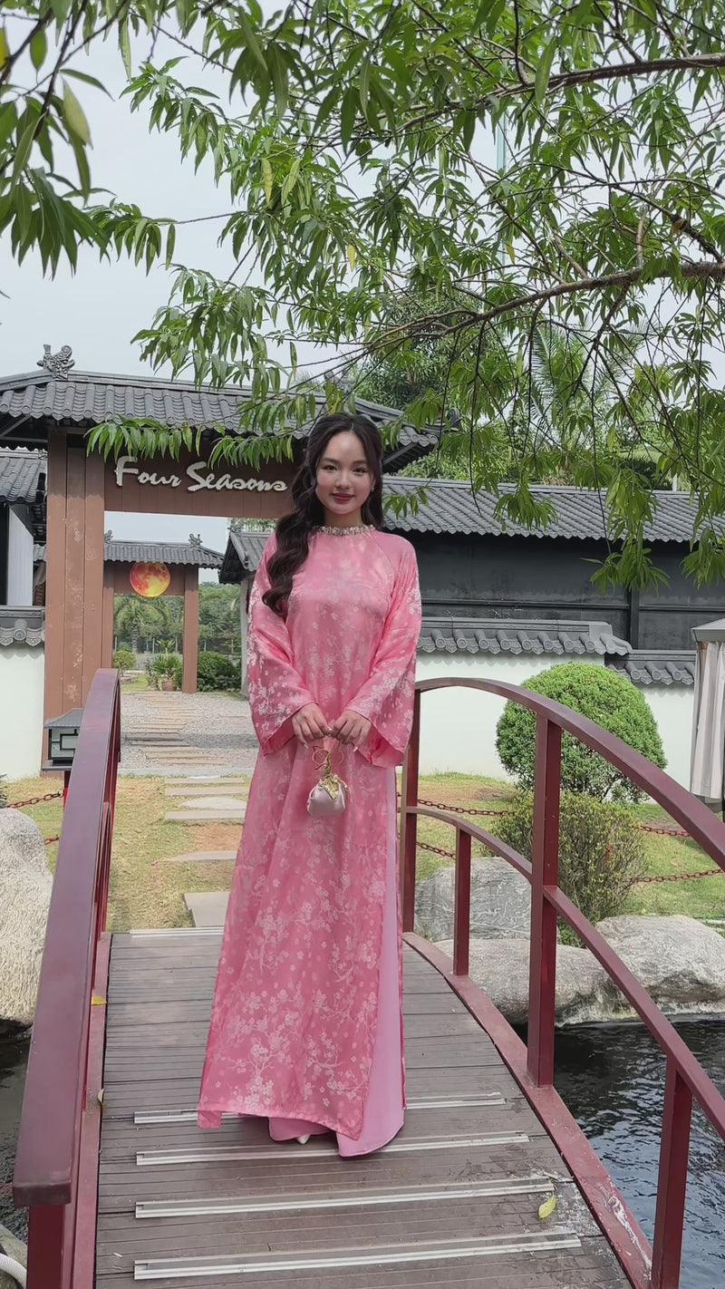 Pink Blossom Crystal Neckline Vietnamese Áo Dài Top No Pants