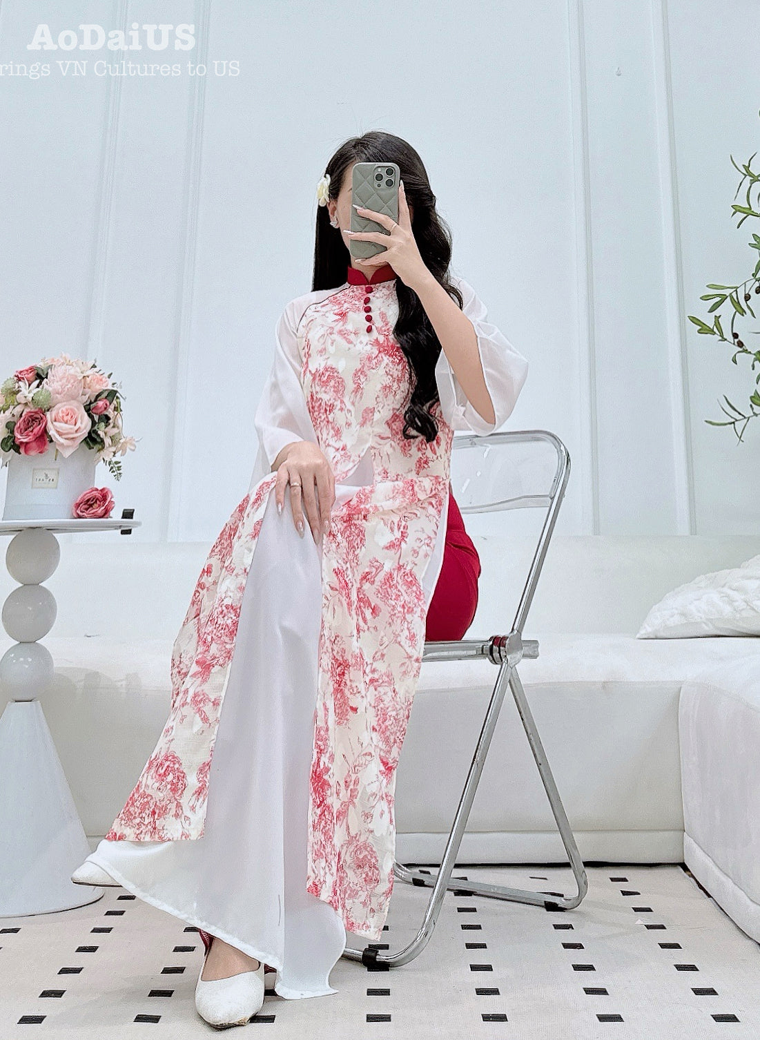 Celebrate elegance and tradition with this Matching Mother & Daughter Áo Dài set. The outfit features delicate floral patterns in red tones, blending modern style with Vietnamese cultural heritage.