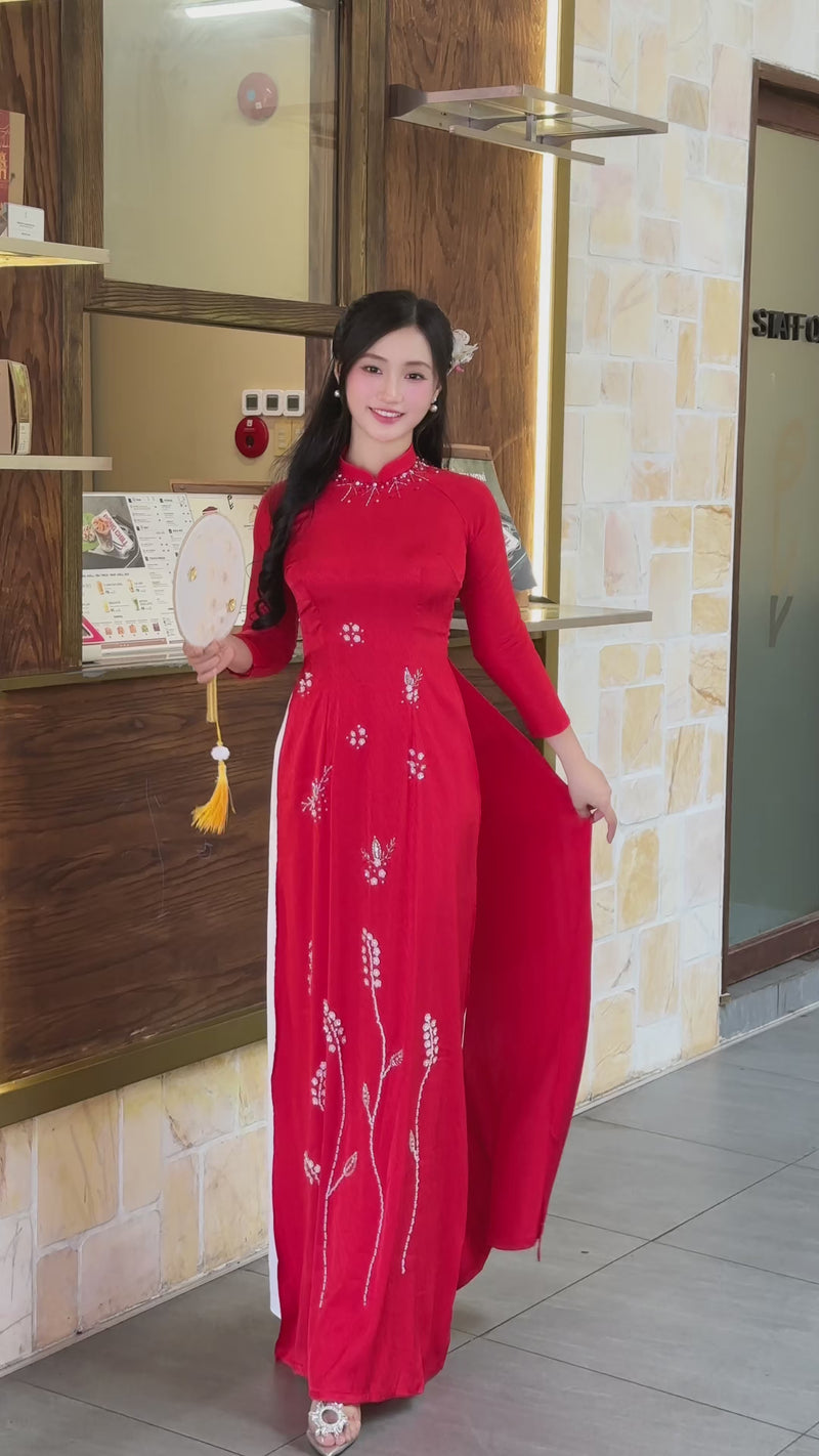 Red Floral Traditional Vietnamese Ao Dai with Hand-Beaded Crystals No pants F39