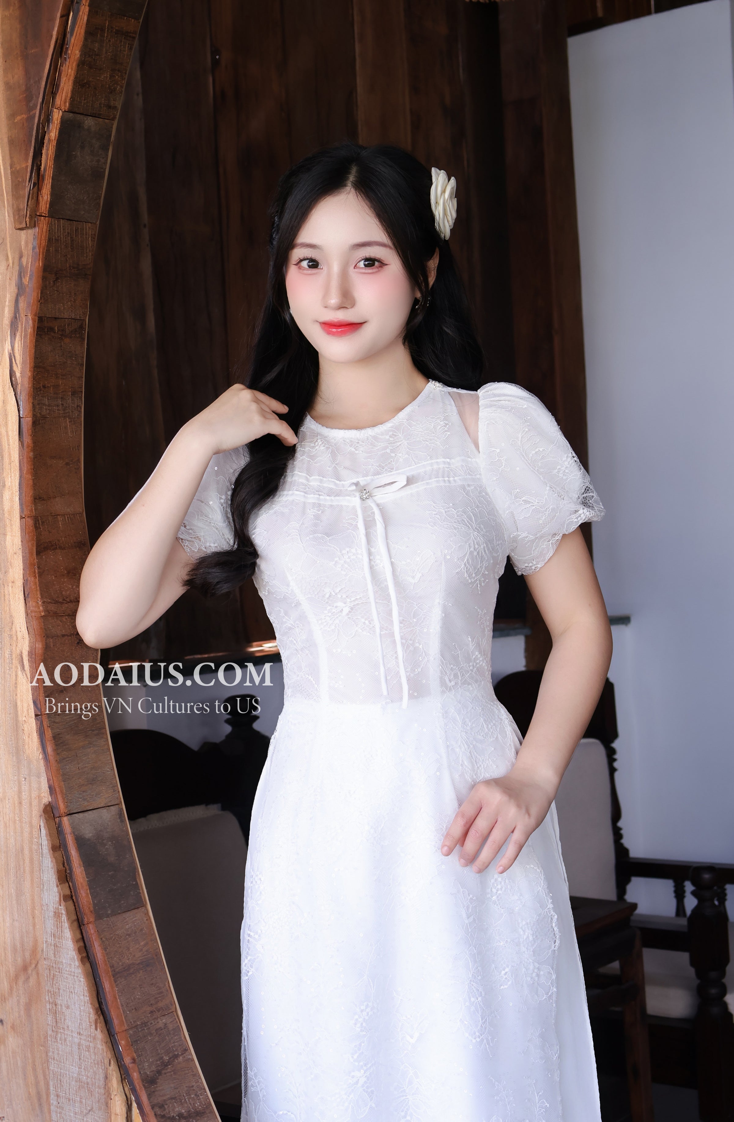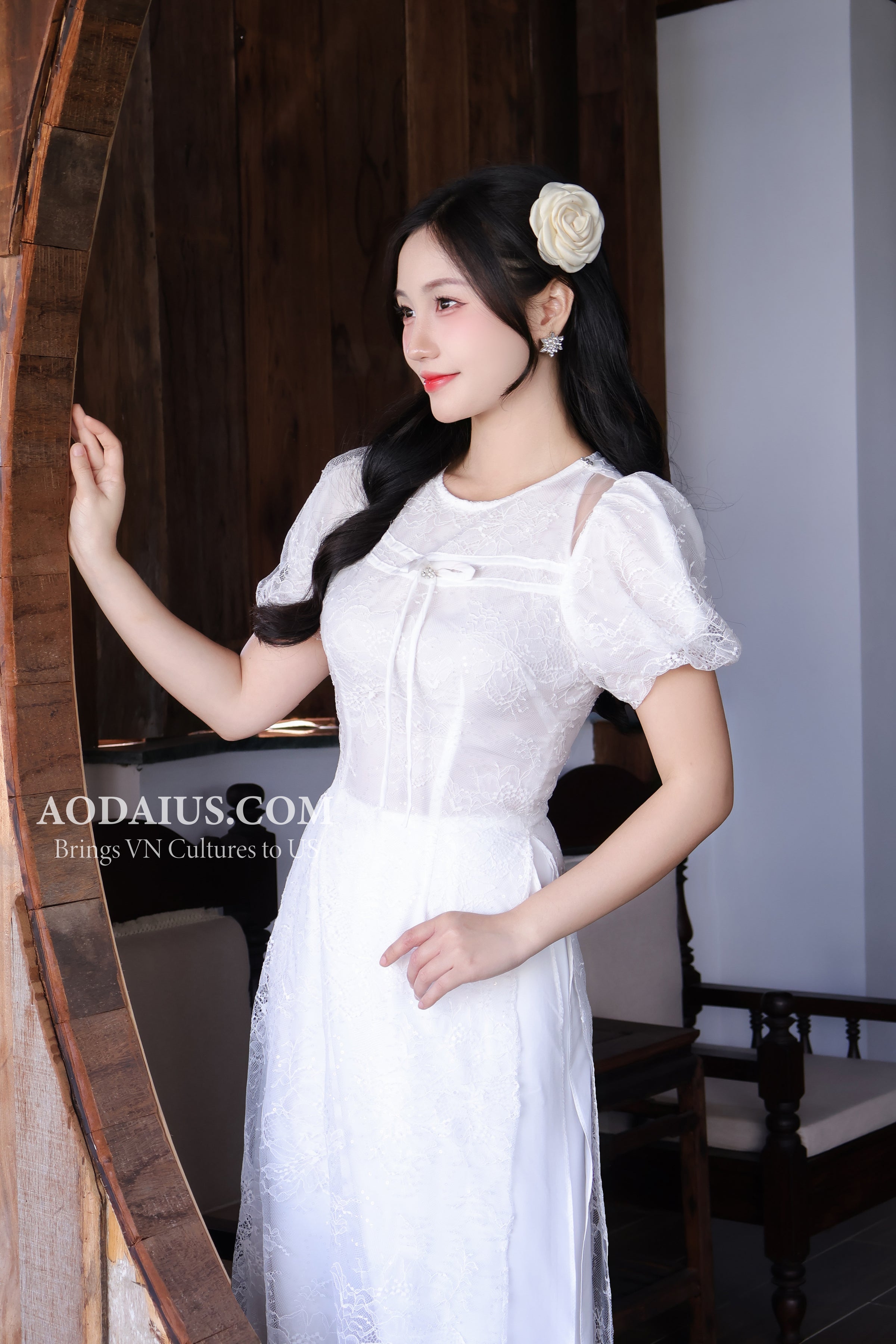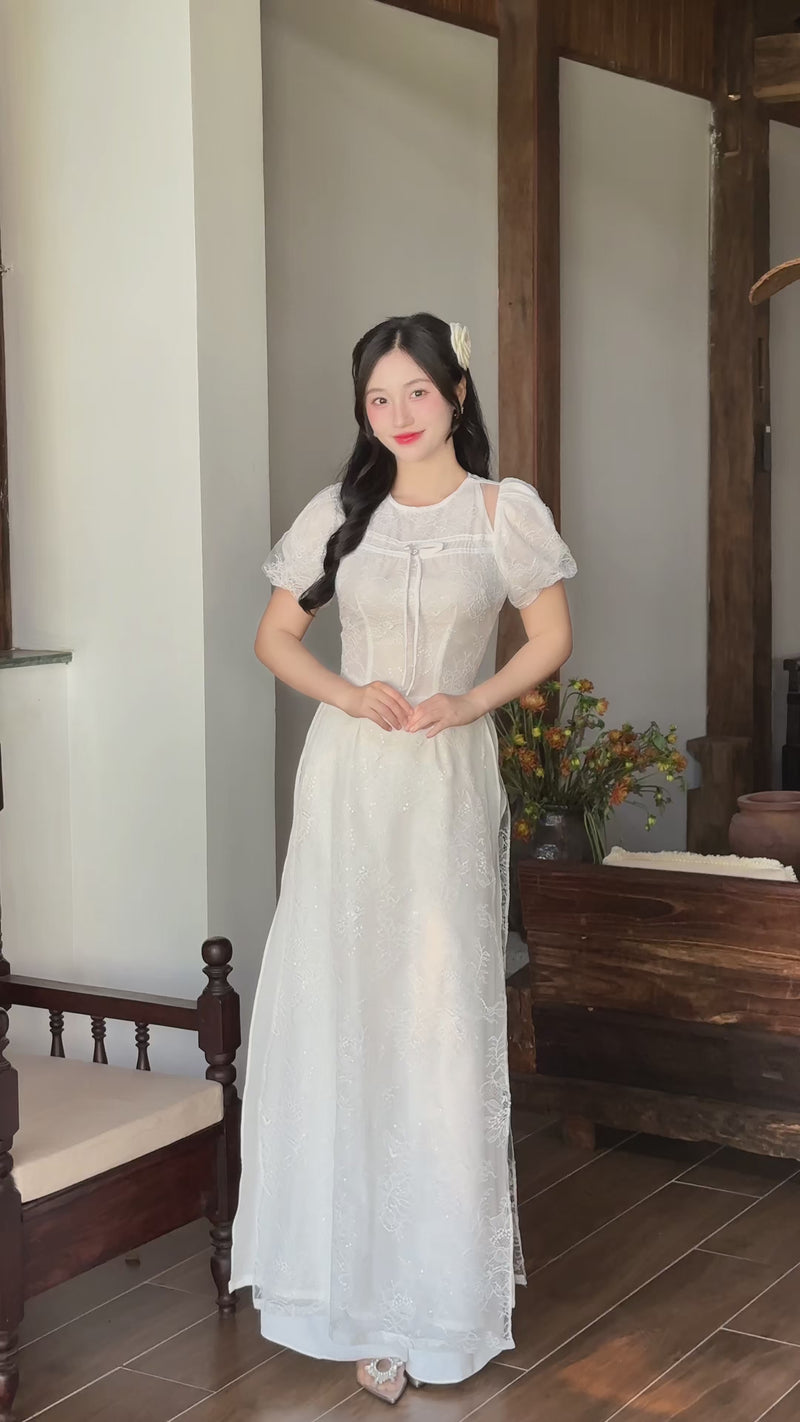 White Lace Floral Vietnamese Modern Ao Dai Dress Top 300