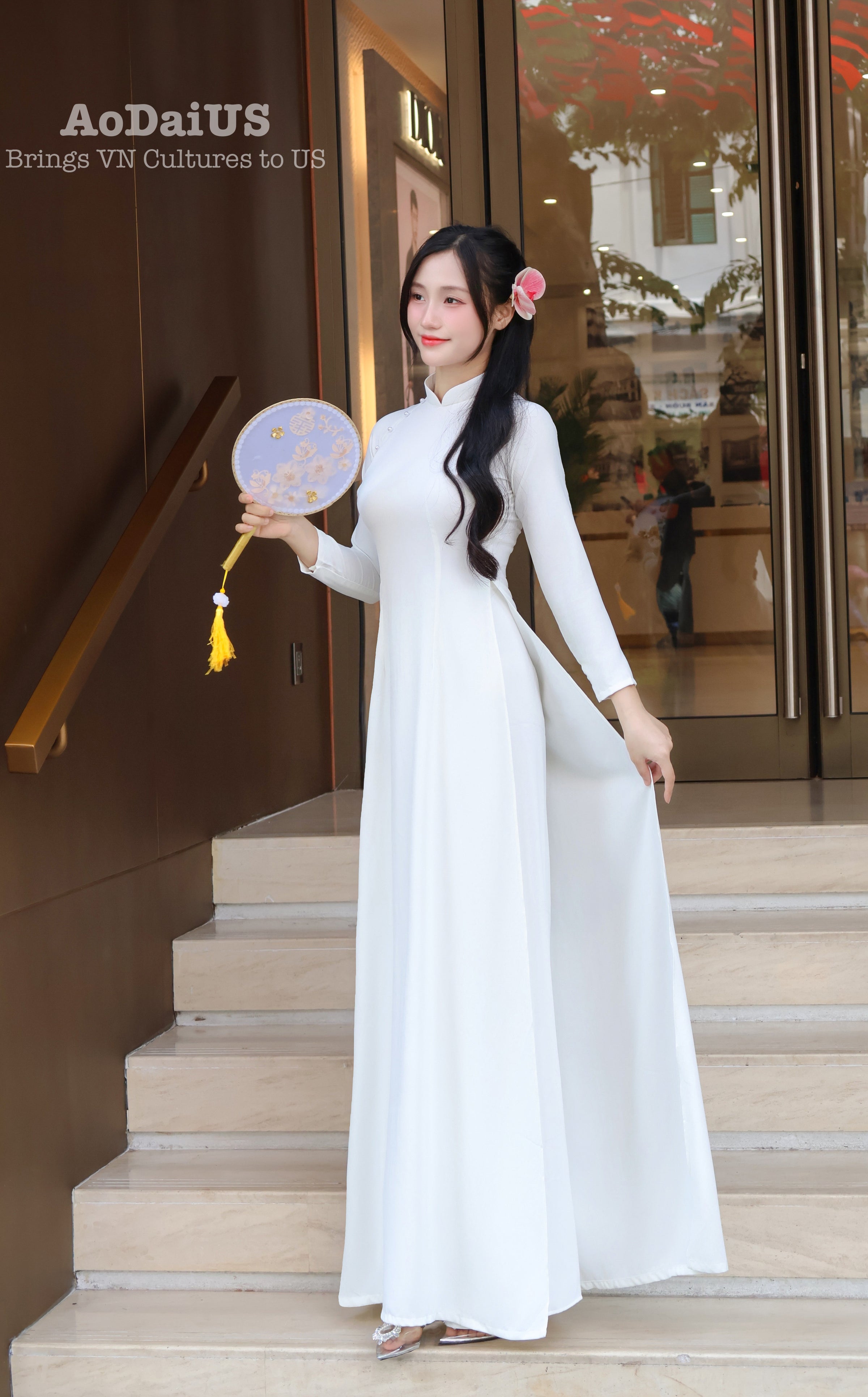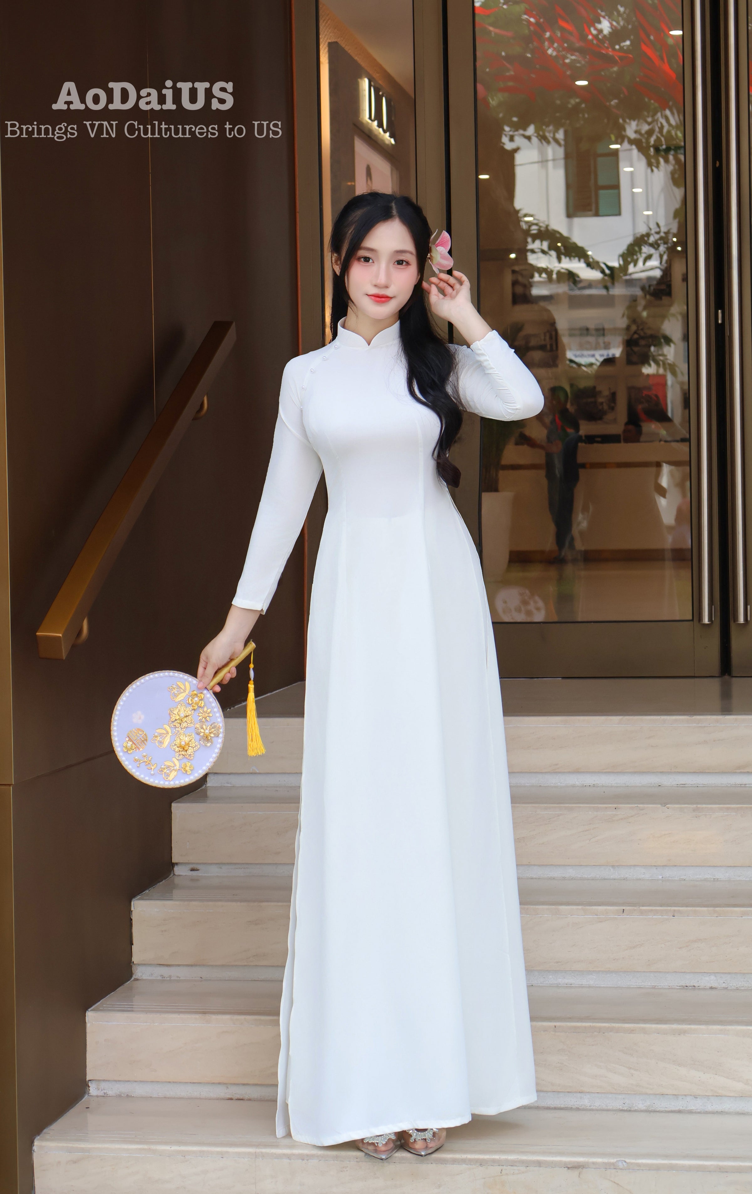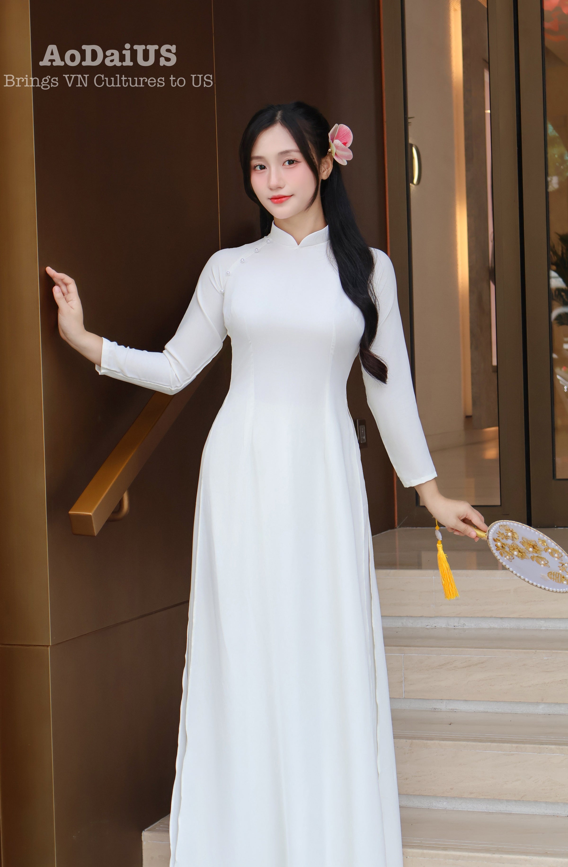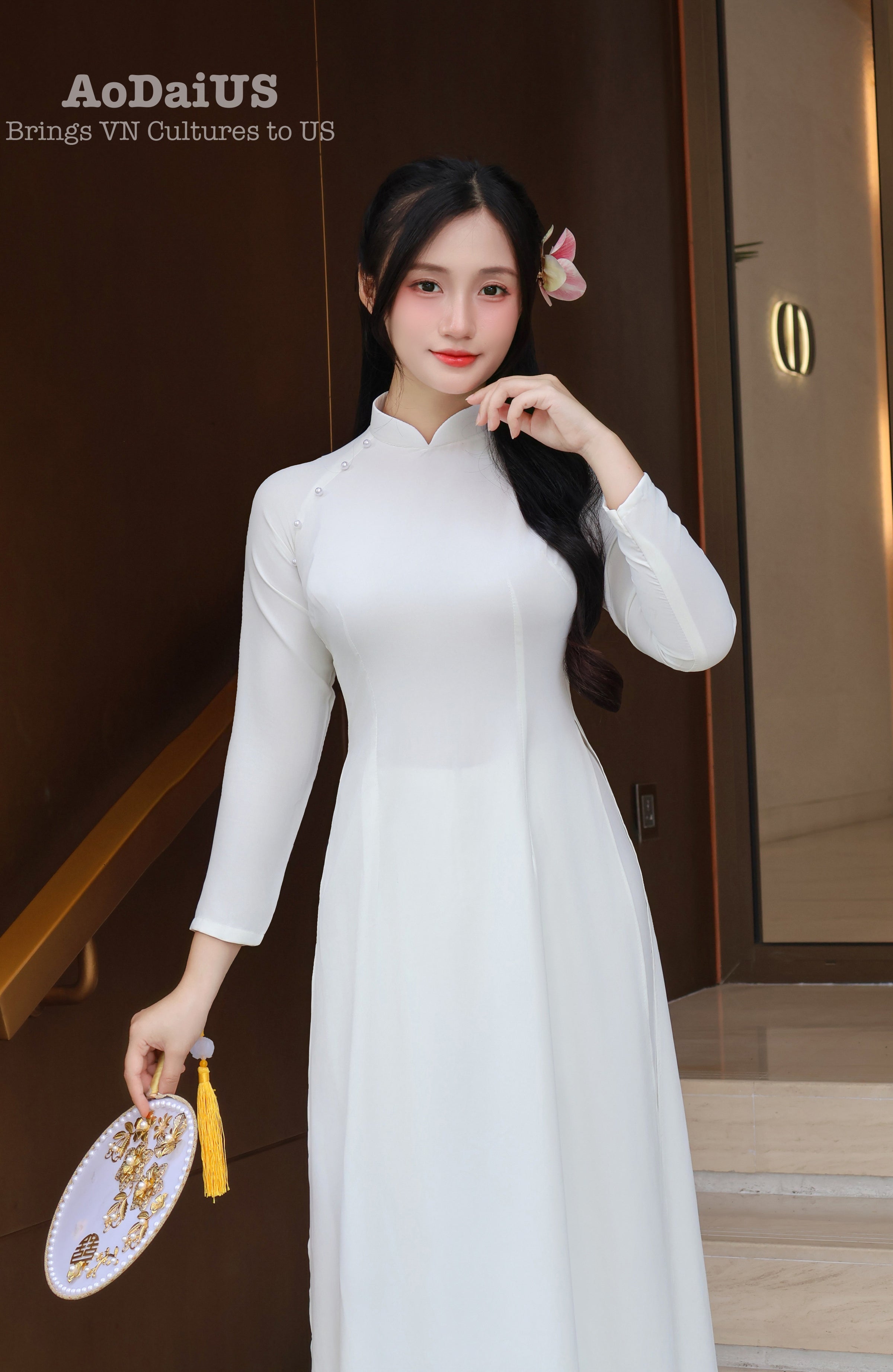 White Plain Vietnamese Ao Dai with Pearls Set C11