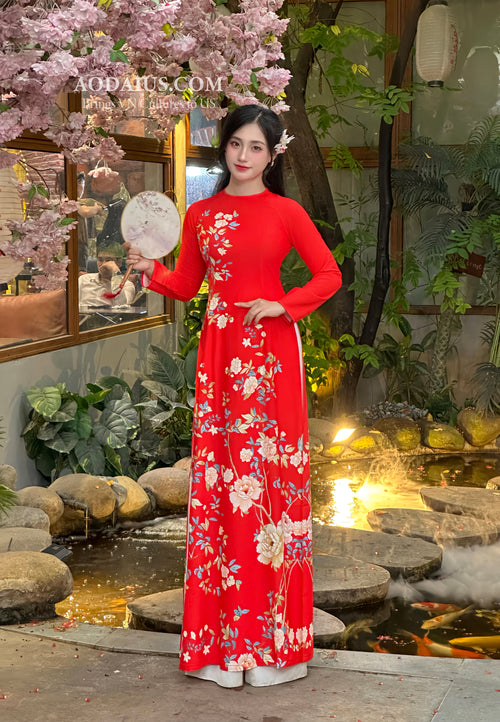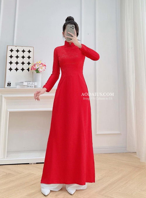 Red Gam Silk Vietnamese Ao Dai No Pants | Áo Dài Truyền Thống N12