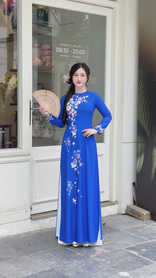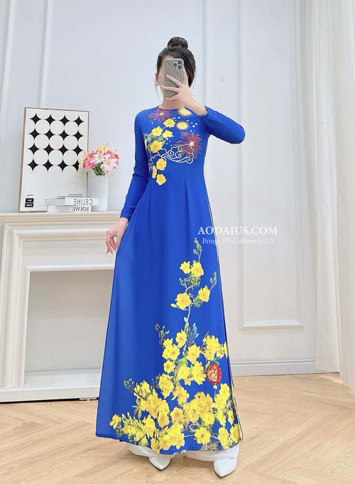 Blue Tet Fireworks & Golden Mai Vietnamese Traditional Ao Dai No Pants H1