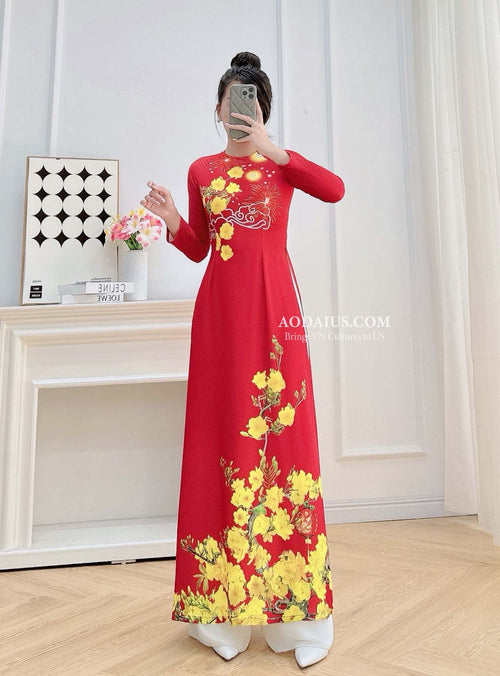 Red Tet Fireworks & Golden Mai Vietnamese Traditional Ao Dai No Pants H1