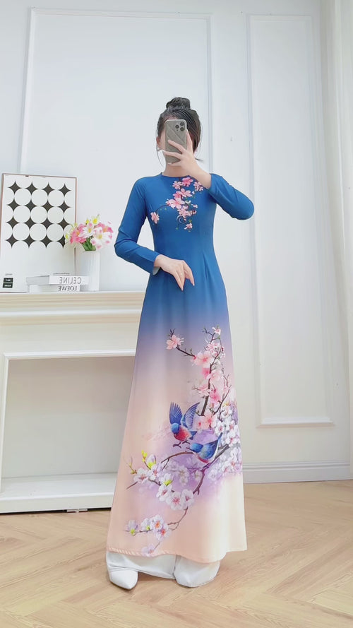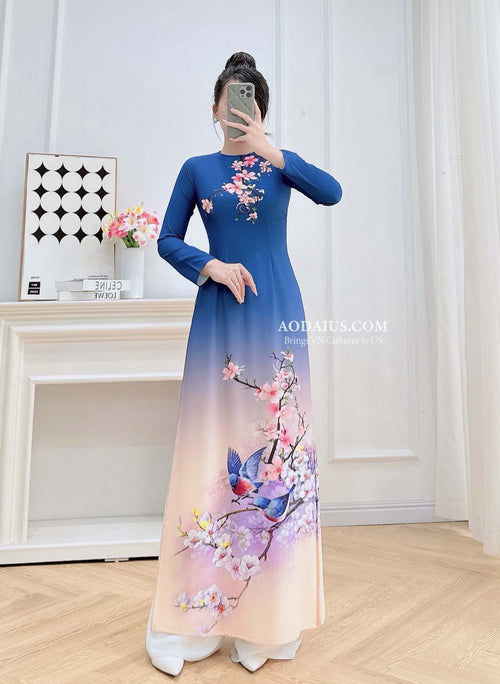 Blue Spring Melody Birds Vietnamese Traditional Ao Dai No Pants N14