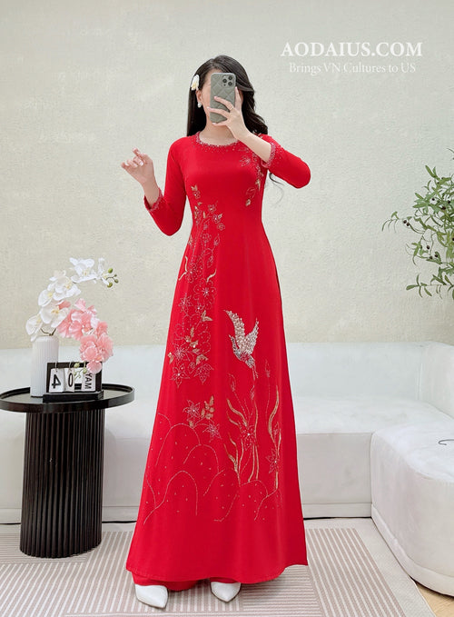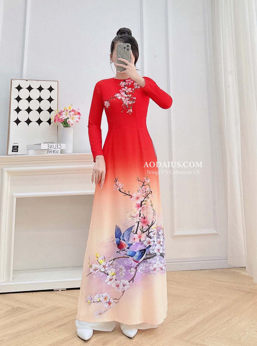 Red Spring Melody Birds Vietnamese Traditional Ao Dai No Pants N14