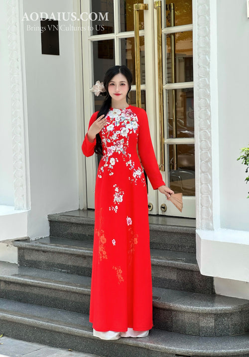 Red Floral Blossom Vietnamese Traditional Ao Dai No Pants I6