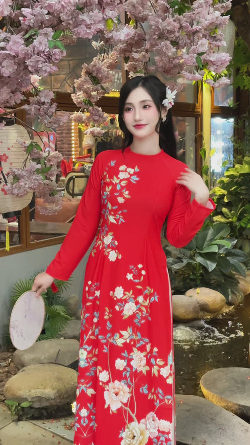 Red Spring Blossom Vietnamese Traditional Ao Dai No Pants I7