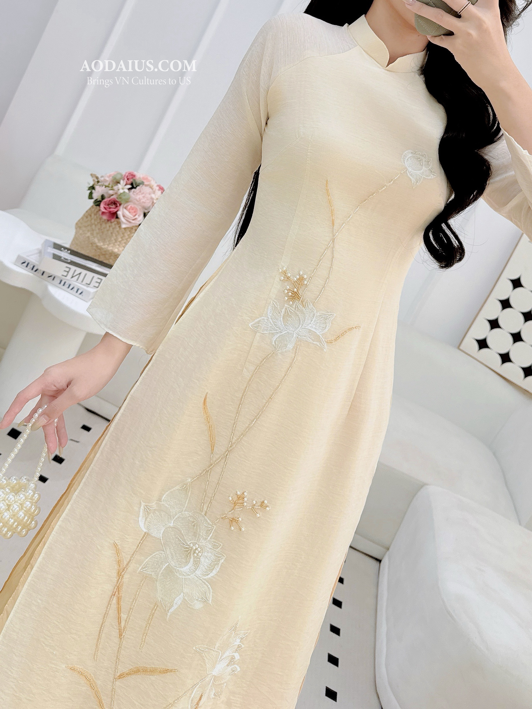 Cream Lotus Embroidered Ao Dai For Women | Traditional Vietnamese Ao Dai O17