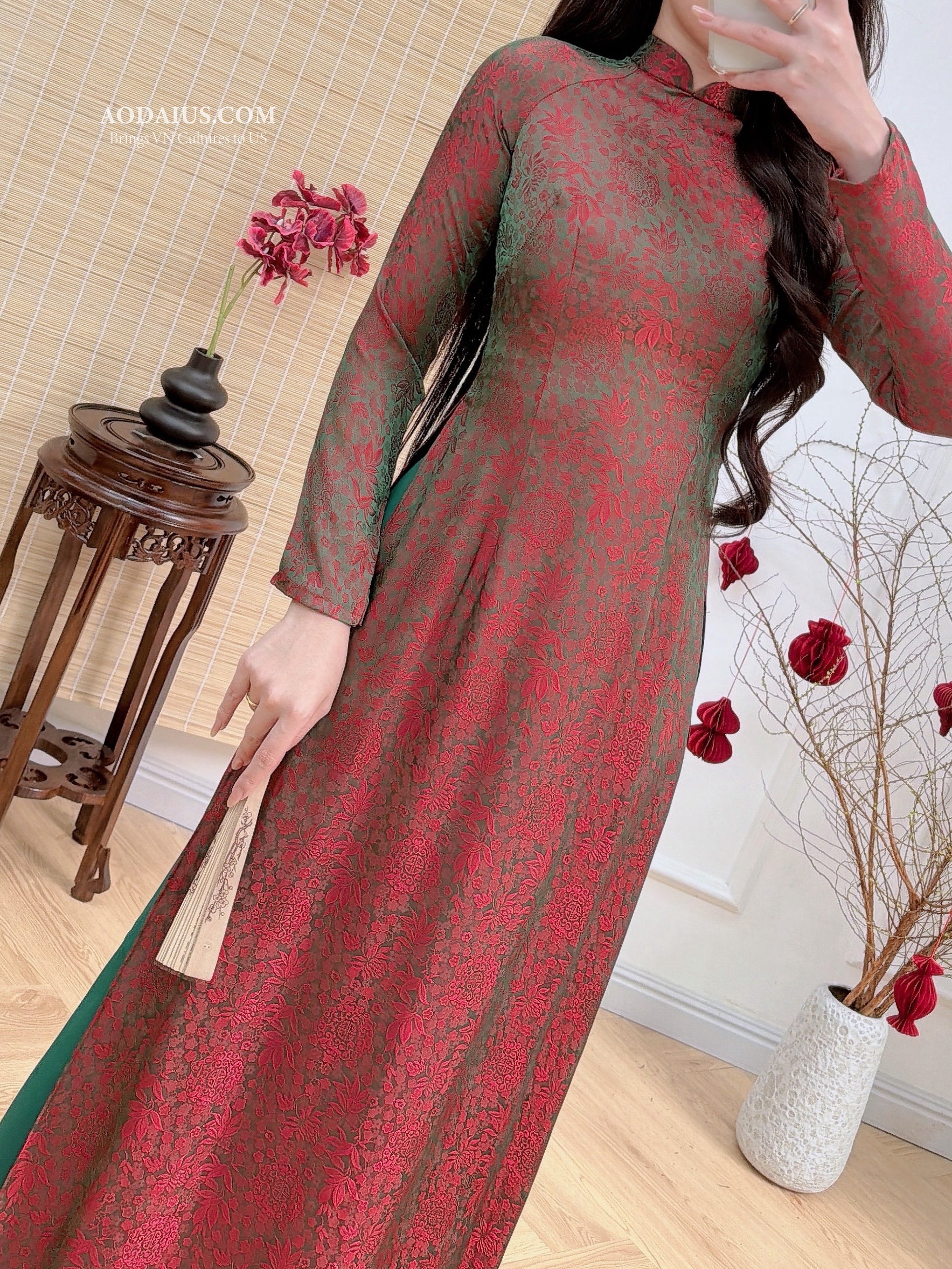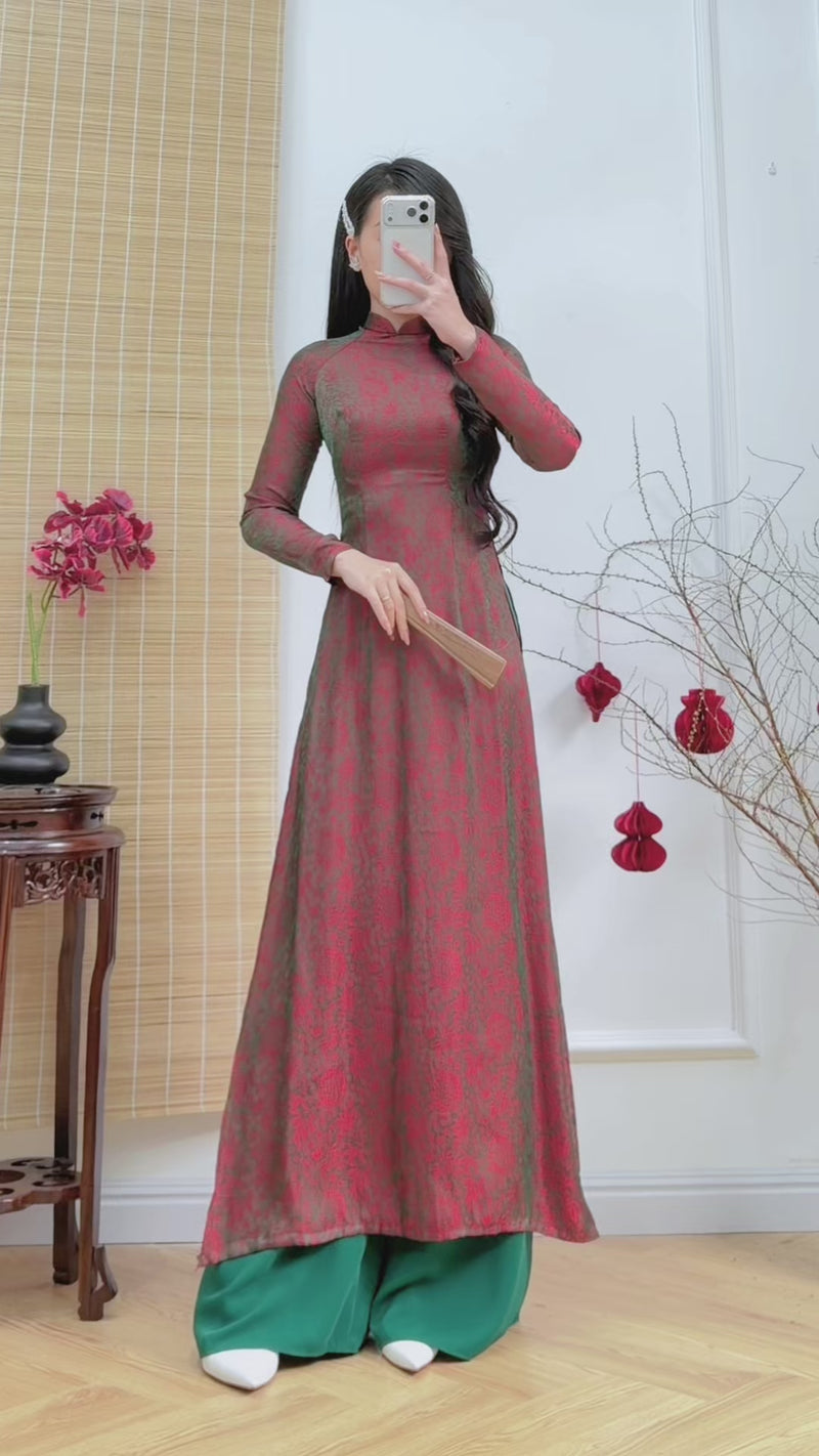 Floral Antique Olive Ruby Traditional Ao Dai Top | Vietnamese Dress O61