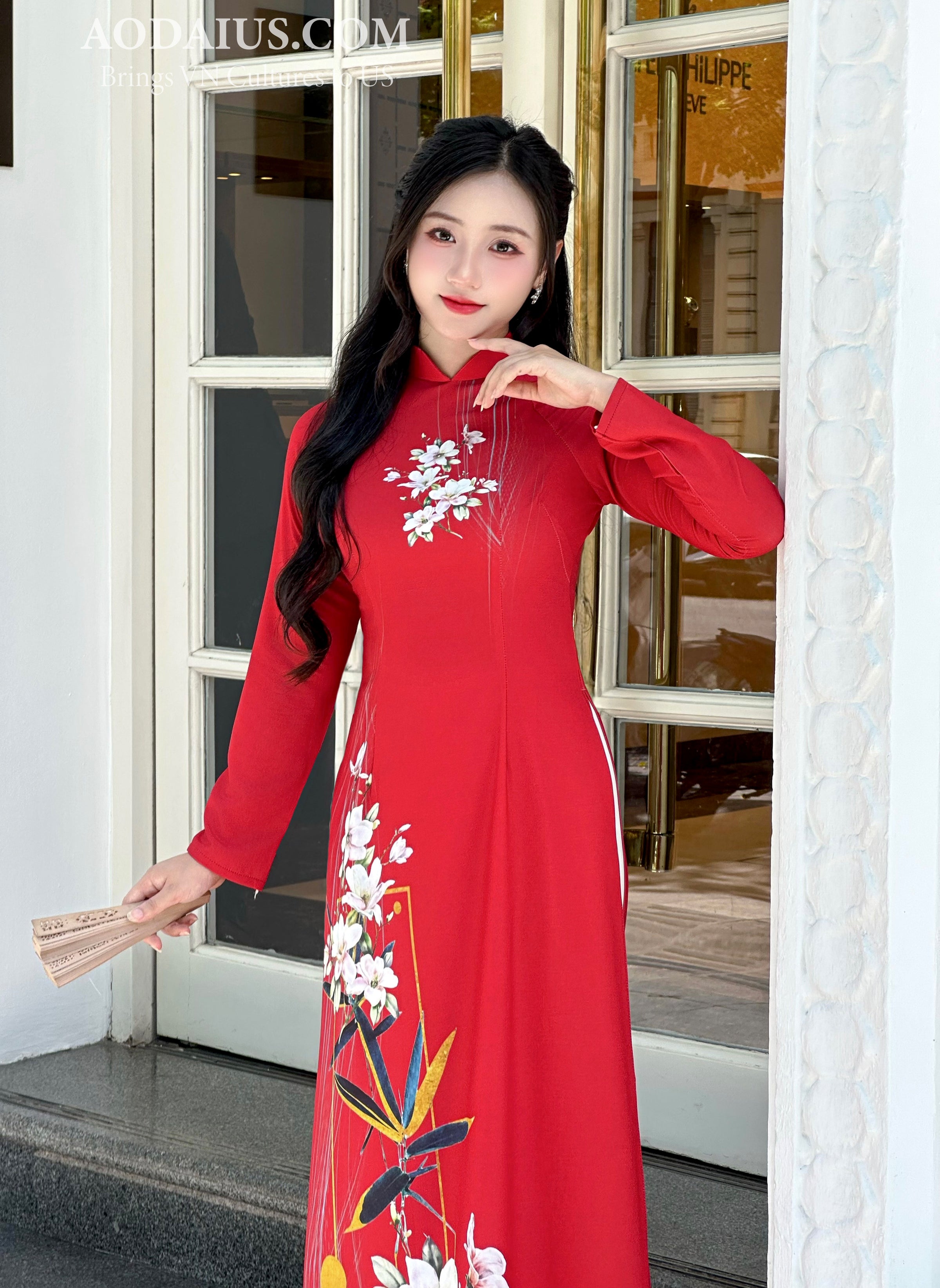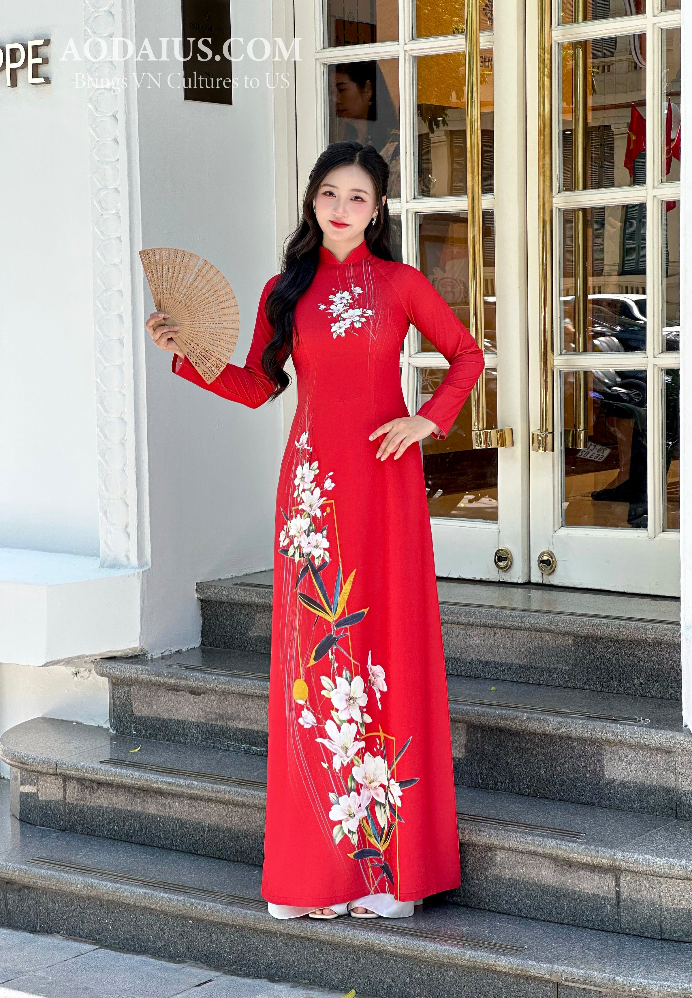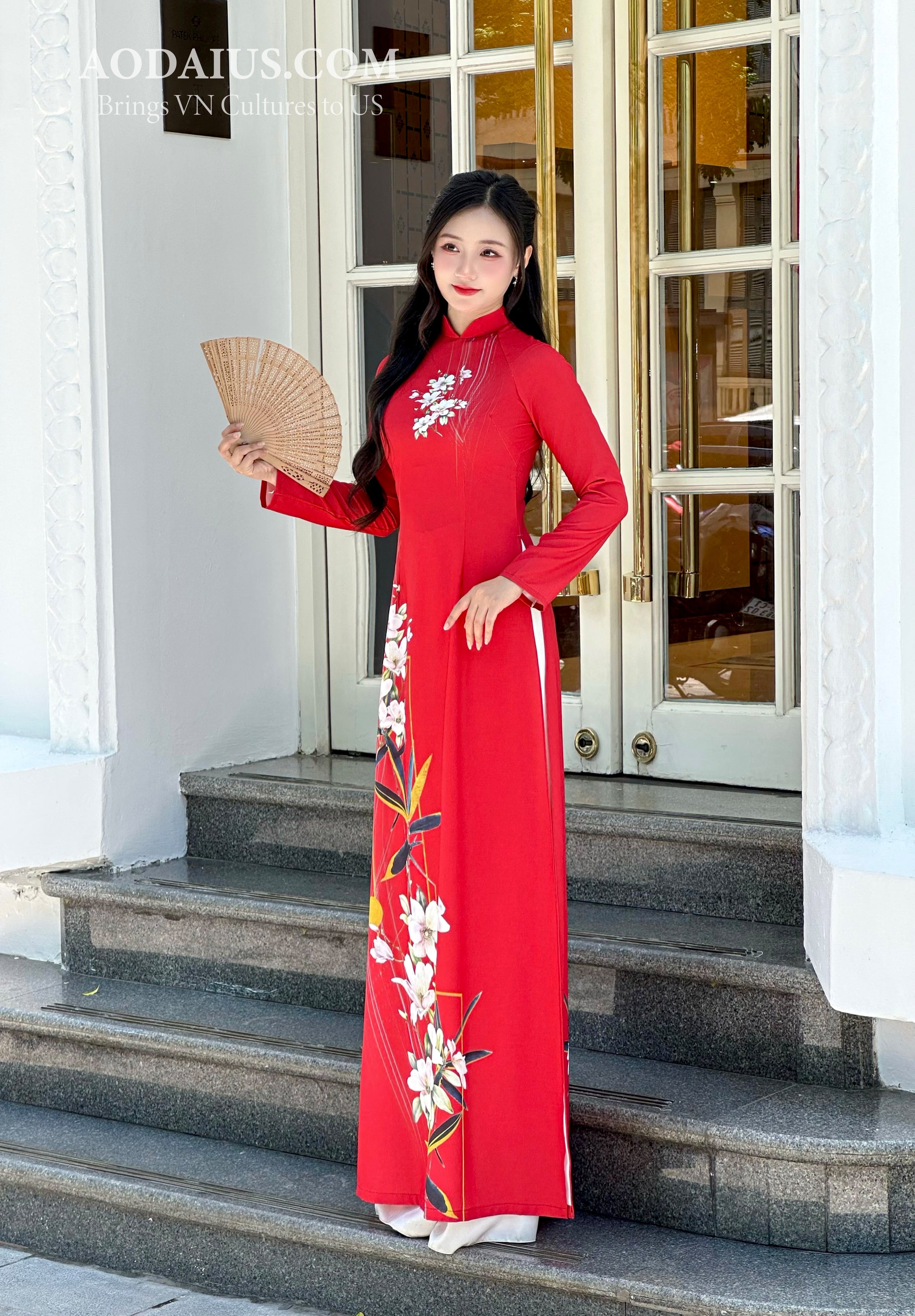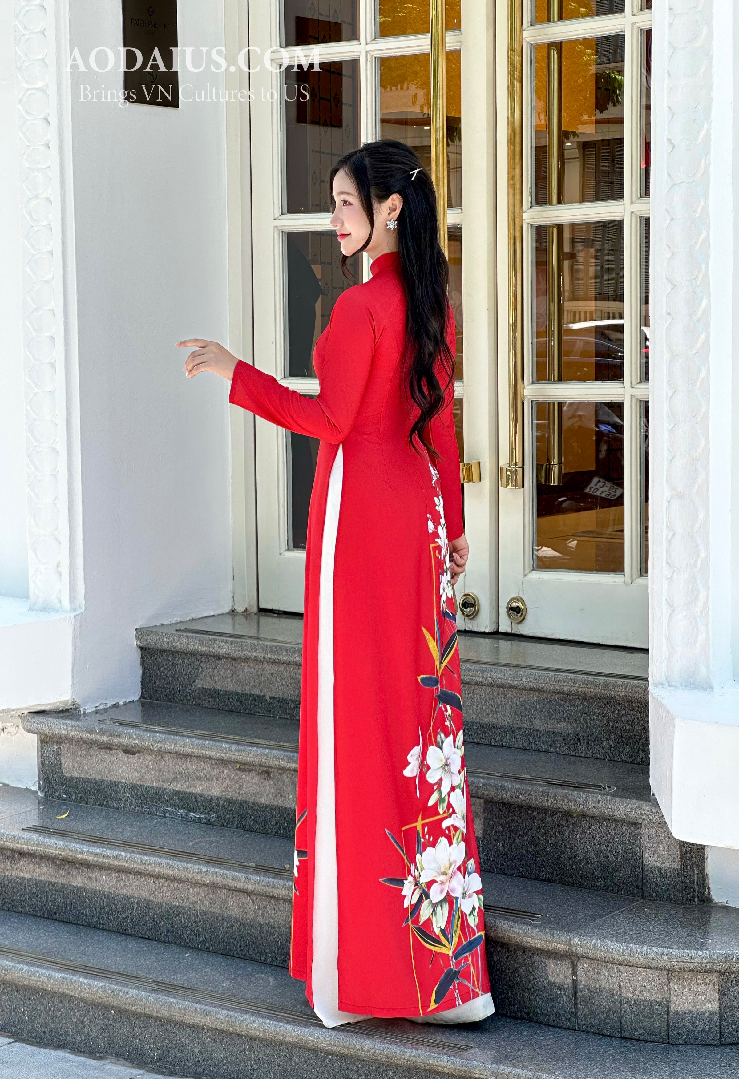 Bring a graceful spring vibe to your celebration with this Red Floral Vietnamese Áo Dài.