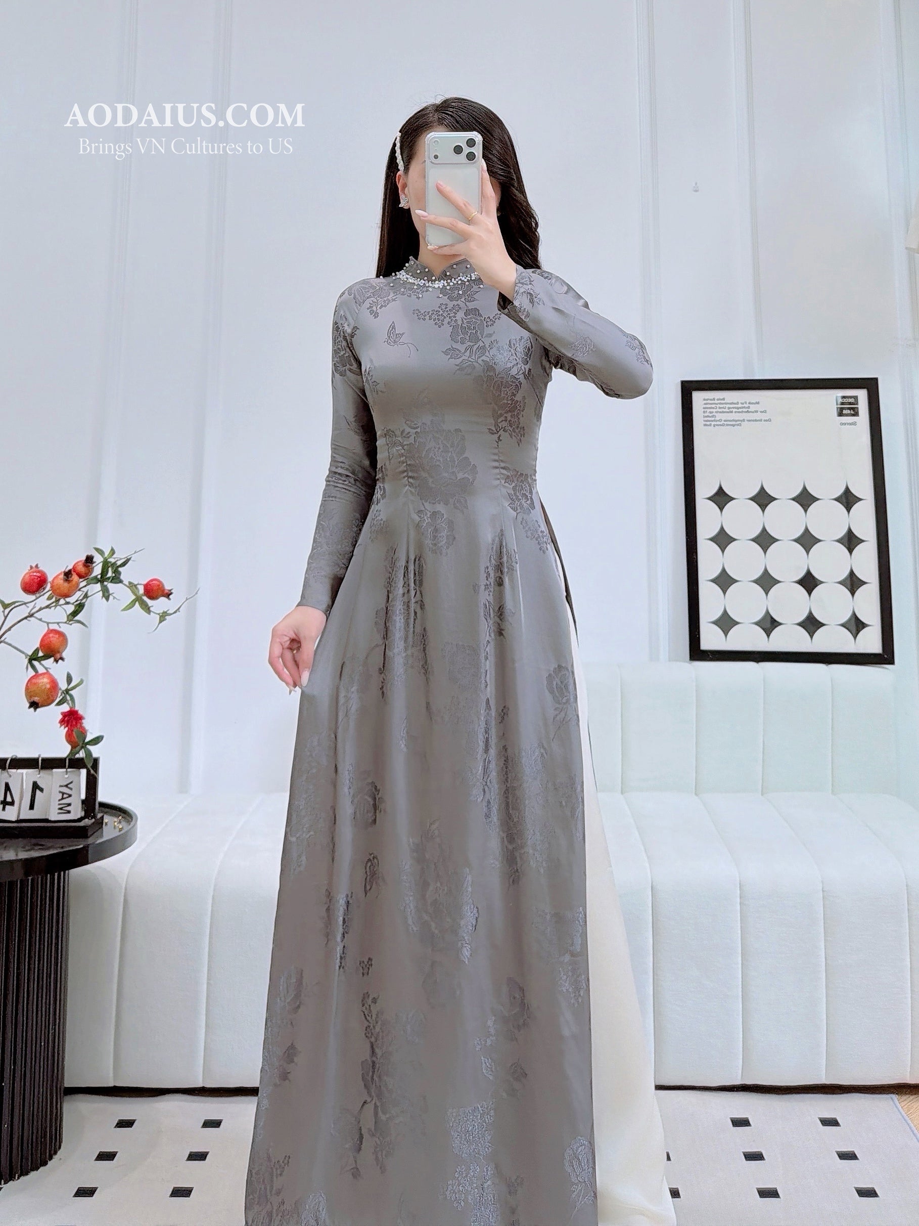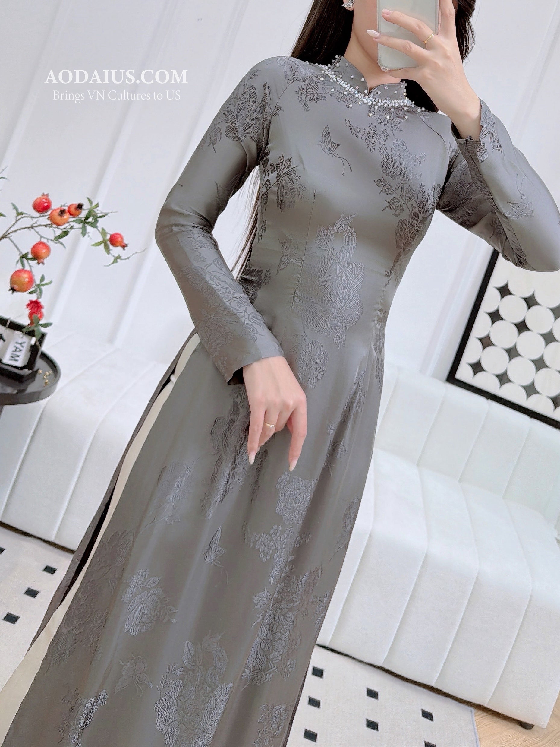Silver Mist Crystal Beaded Neck Vietnamese Ao Dai