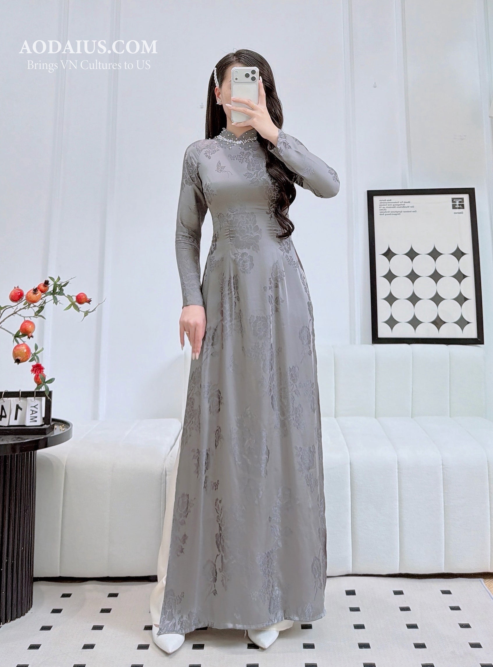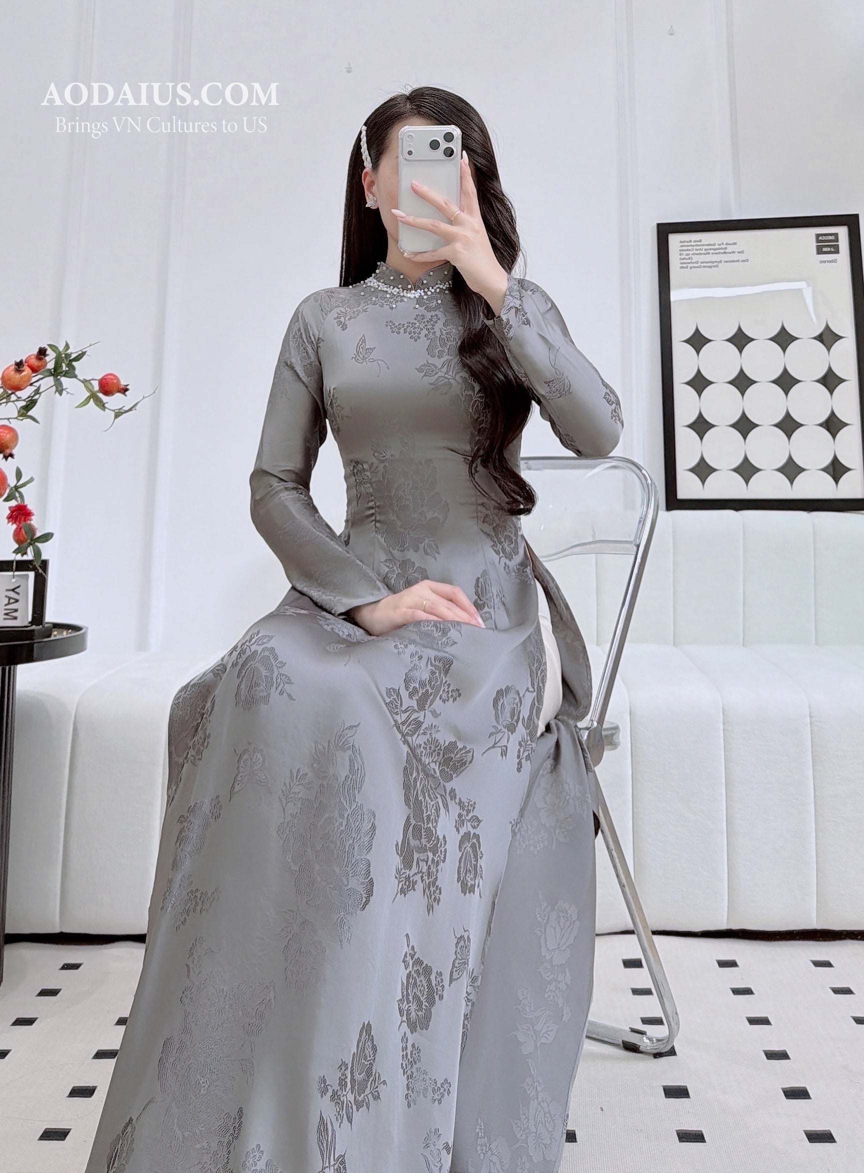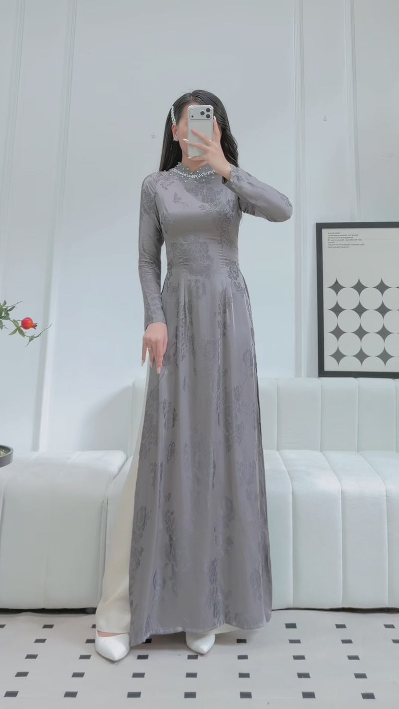 Elegant and refined, the Silver Mist Vietnamese Áo Dài is made from soft, lightweight Lụa tơ óng with a luxurious silver tone that looks stunning in photos. The highlight is the sparkling crystal beading around the chest and neckline, creating a sophisticated statement while keeping the traditional silhouette-perfect for weddings, engagement events, formal parties, and Tết celebrations.