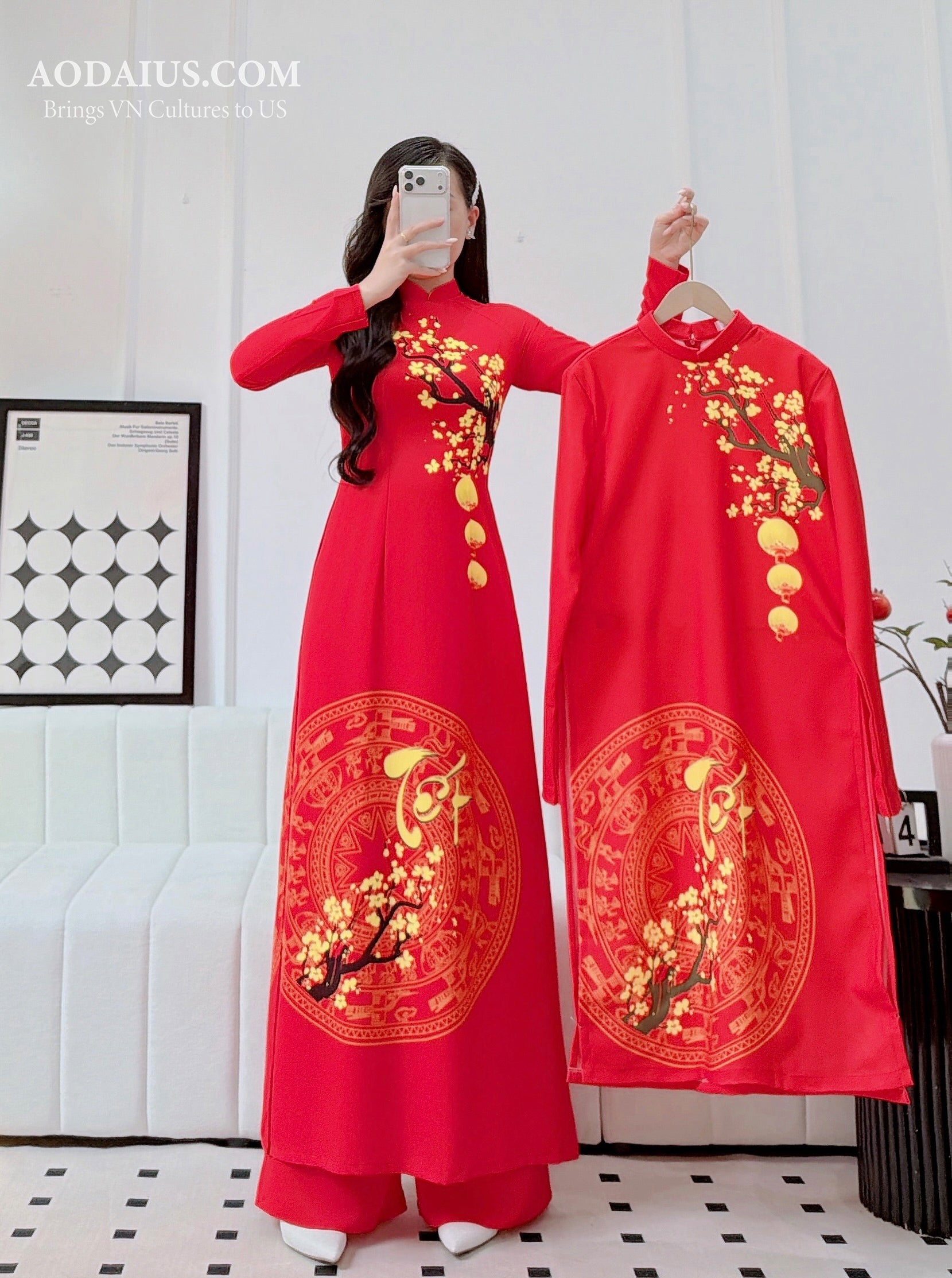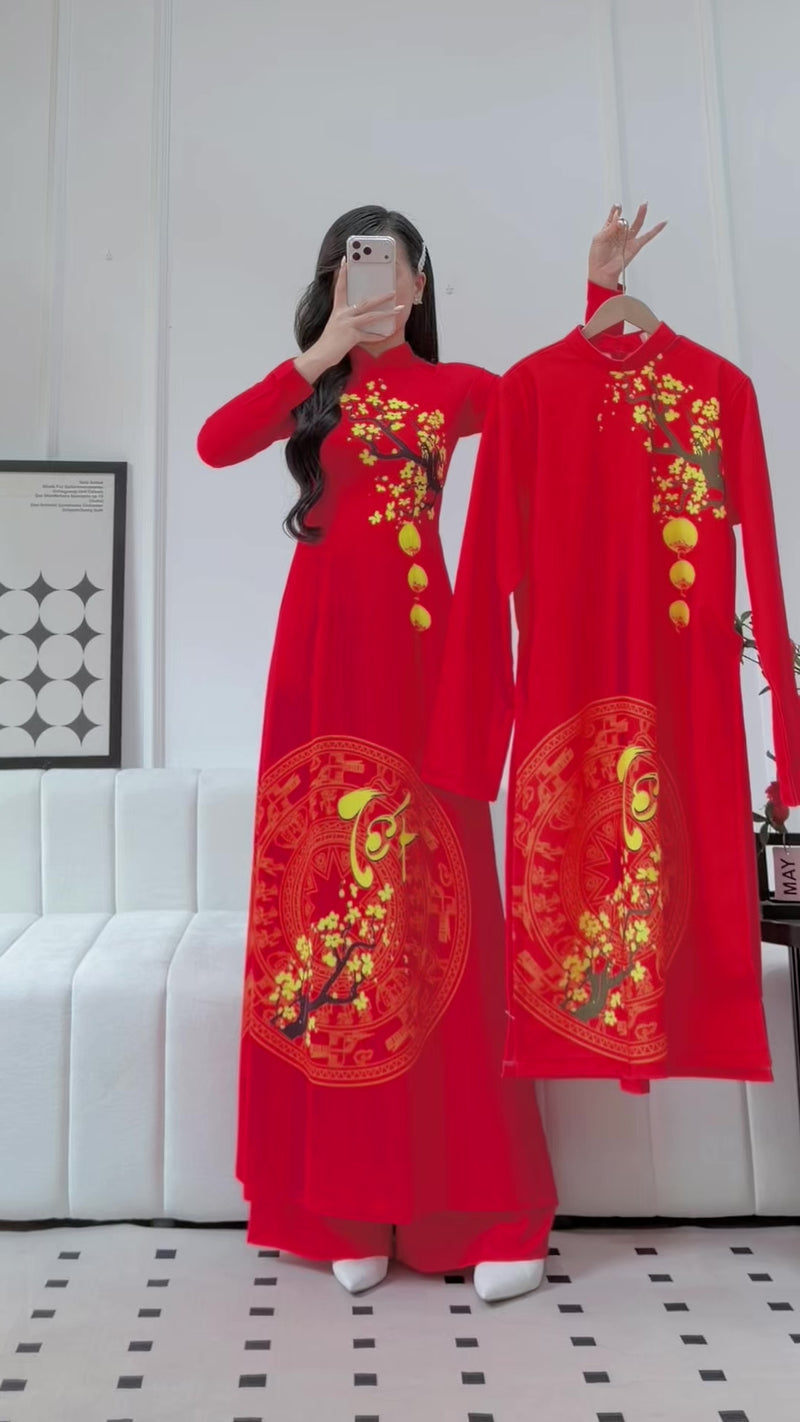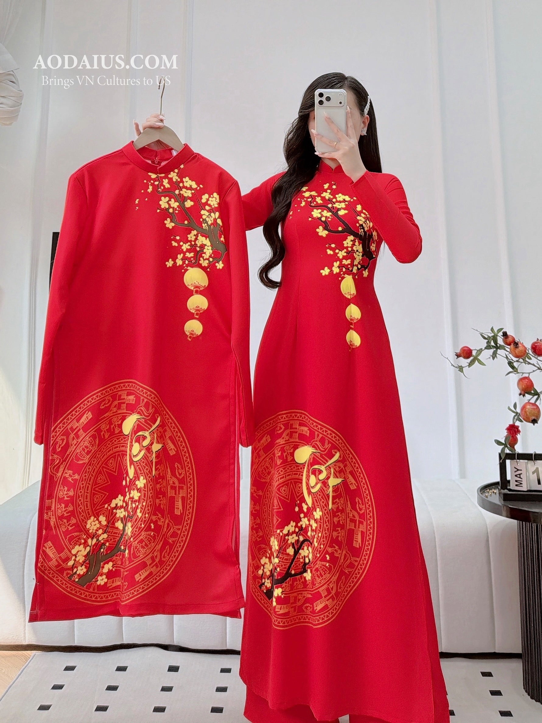 Celebrate Tết in style with this matching Vietnamese Áo Dài set featuring lucky mai blossoms (hoa mai), glowing lantern details, and a bold Đông Sơn drum (trống đồng) motif for prosperity and good fortune. The vibrant red color is perfect for Lunar New Year, engagement photos, and family celebrations.