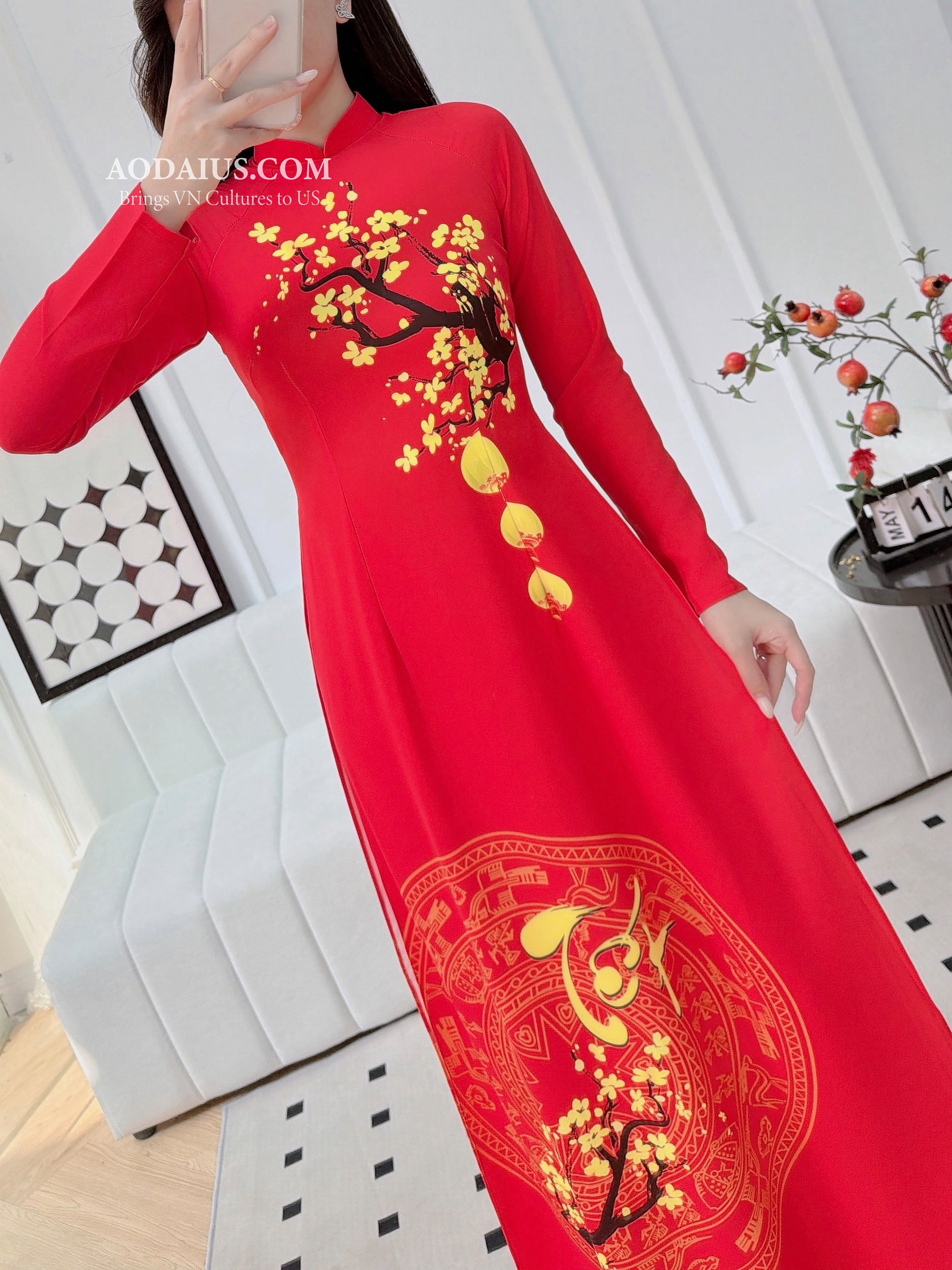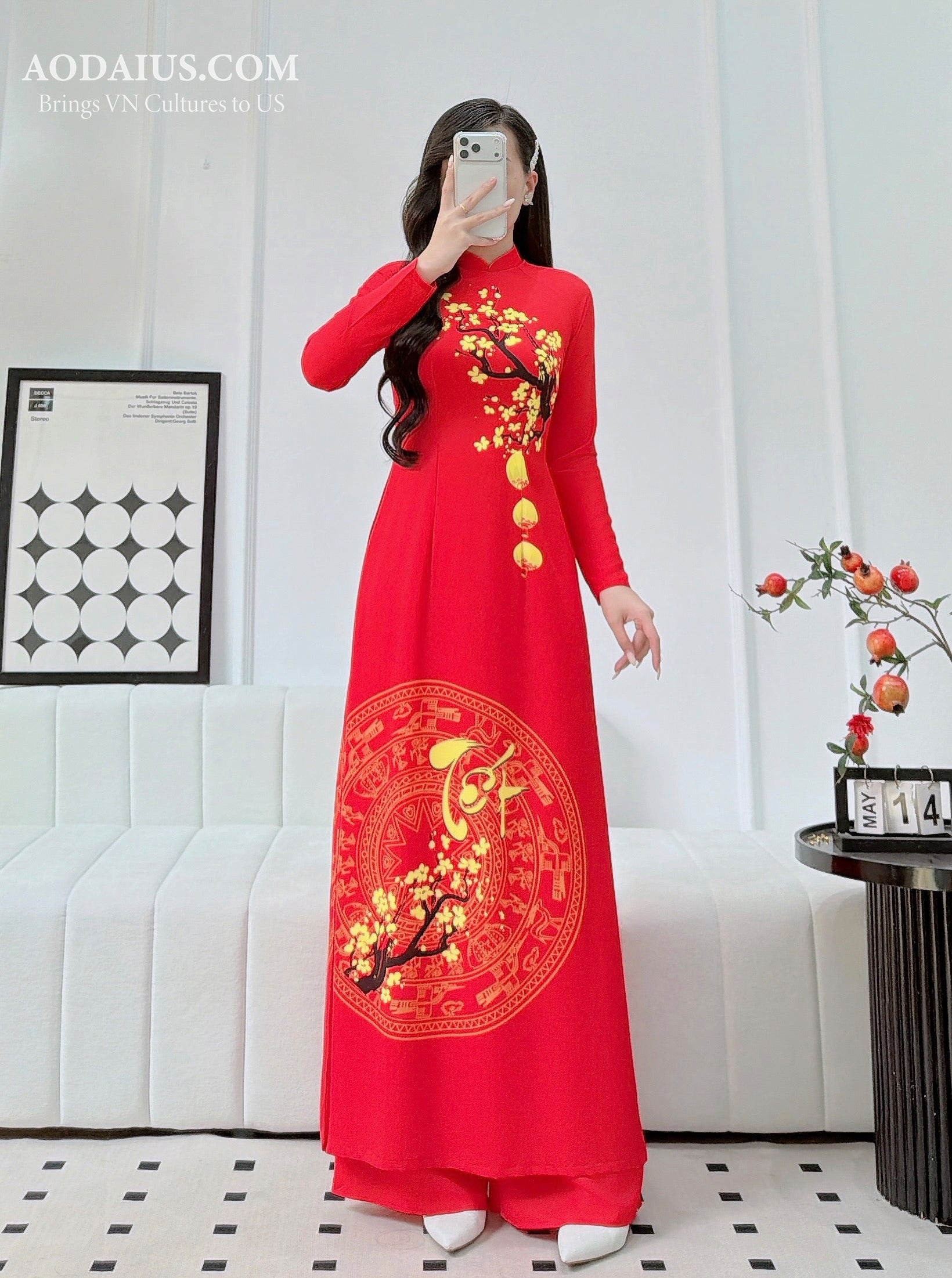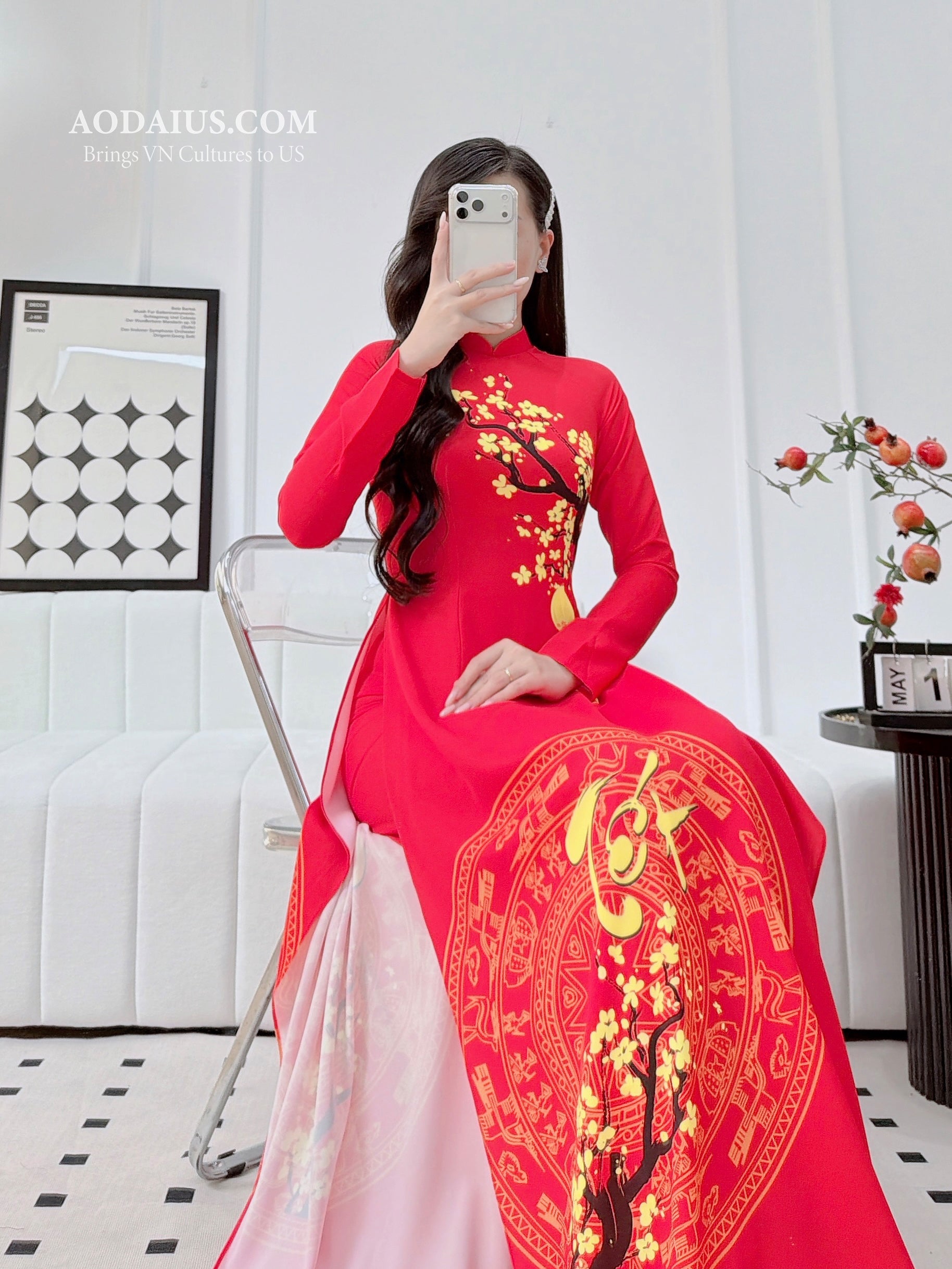 Celebrate Tết in style with this matching Vietnamese Áo Dài set featuring lucky mai blossoms (hoa mai), glowing lantern details, and a bold Đông Sơn drum (trống đồng) motif for prosperity and good fortune. The vibrant red color is perfect for Lunar New Year, engagement photos, and family celebrations.