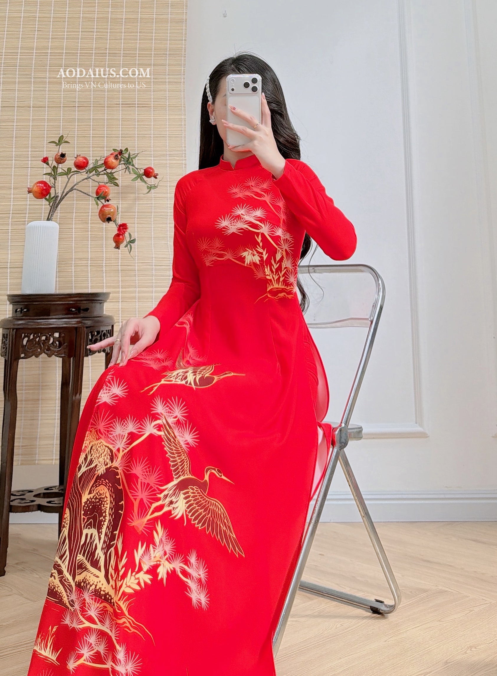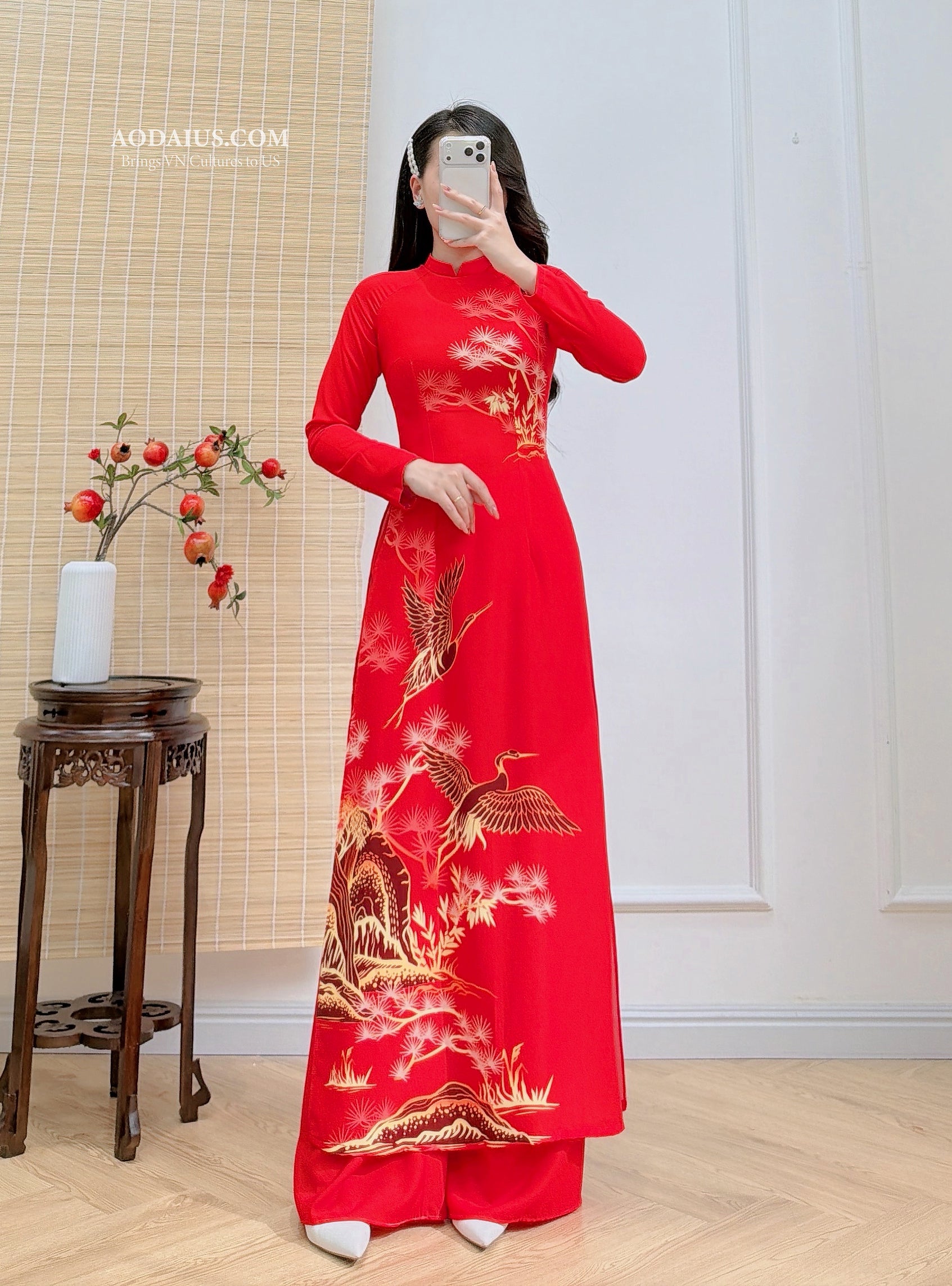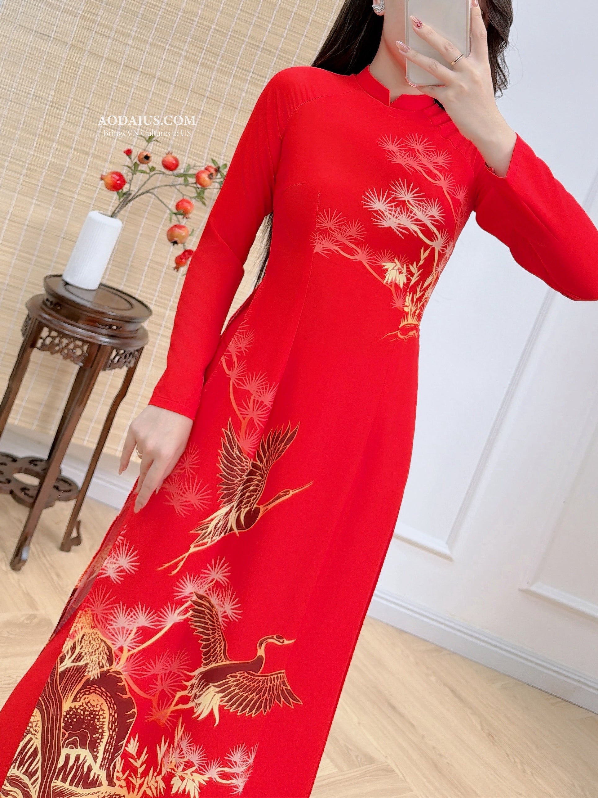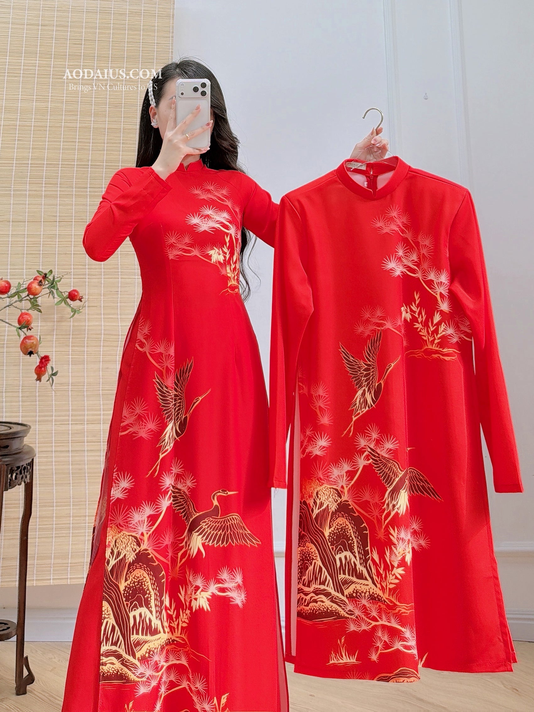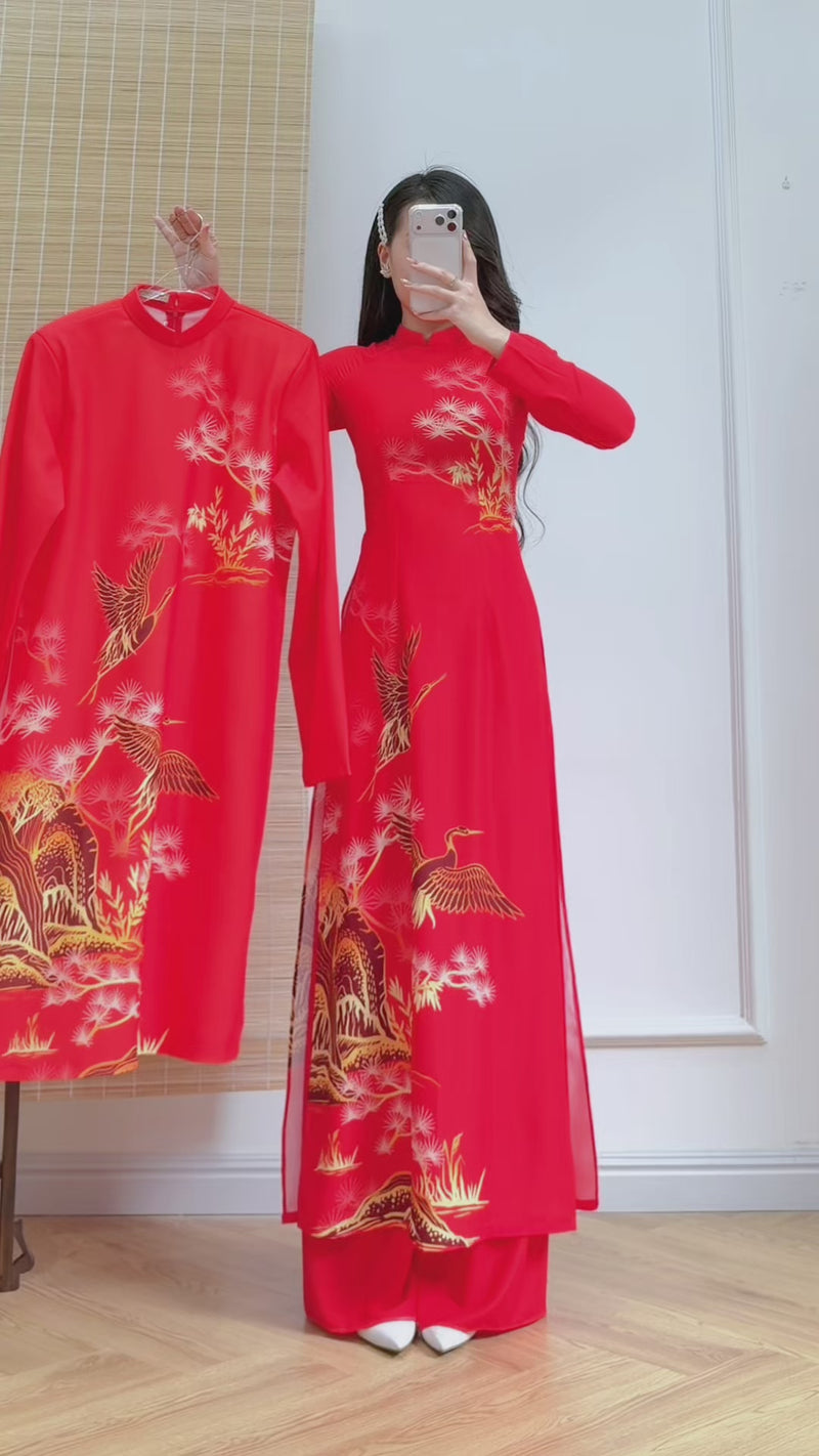 Celebrate Tết in a timeless red matching Áo Dài set featuring an elegant crane–mountain (Hạc Tùng Sơn Thủy) print. The bright red symbolizes luck and joy, while cranes and trees represent longevity, prosperity, and good fortune-perfect for Lunar New Year photos, weddings, and family gatherings.