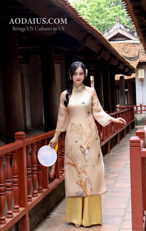 Cream Ao Dai with Lotus Flowers | Vietnamese Ao Dai Set I8