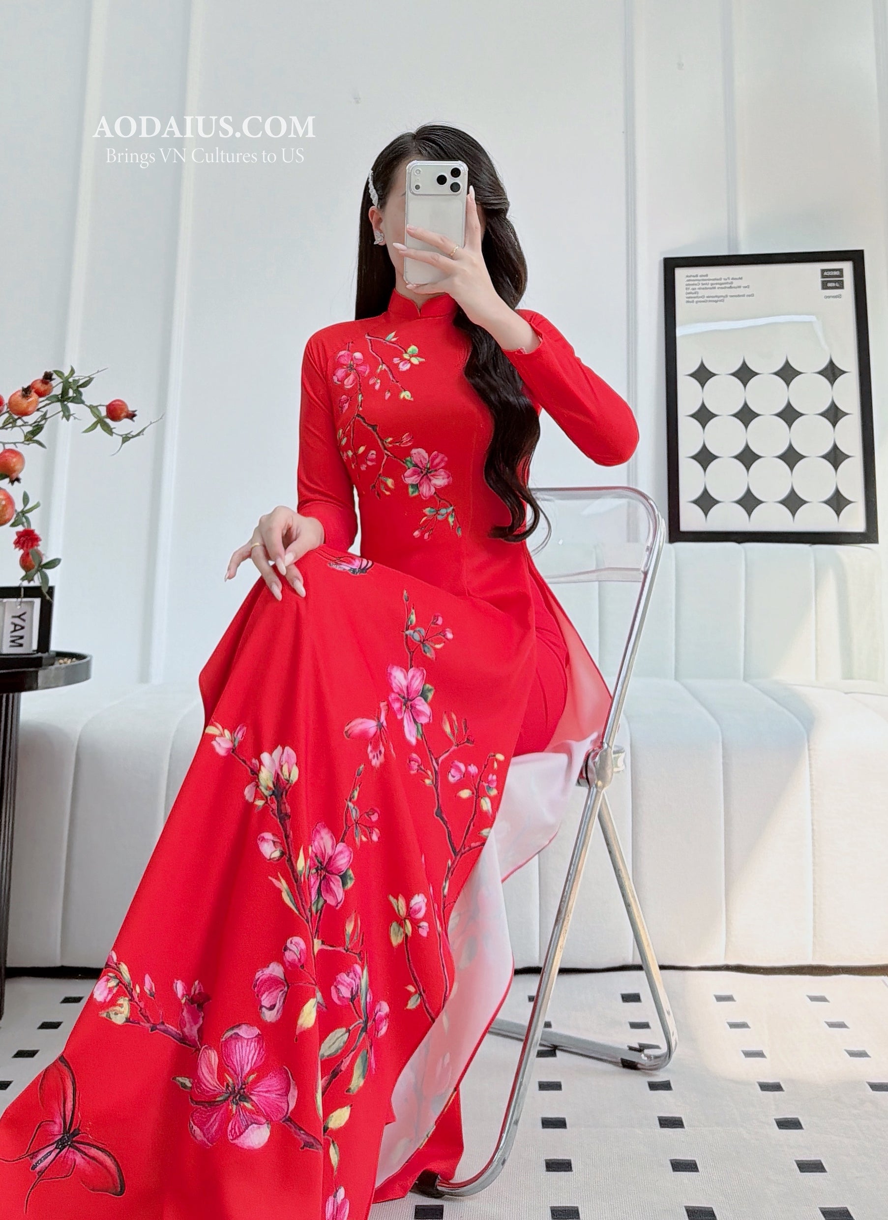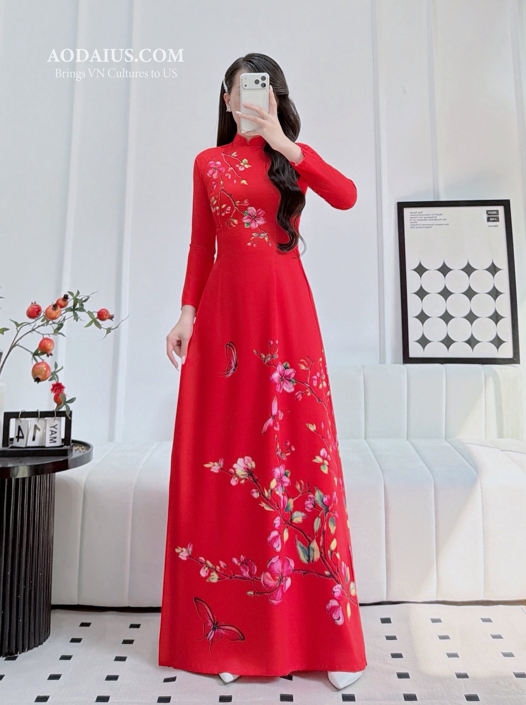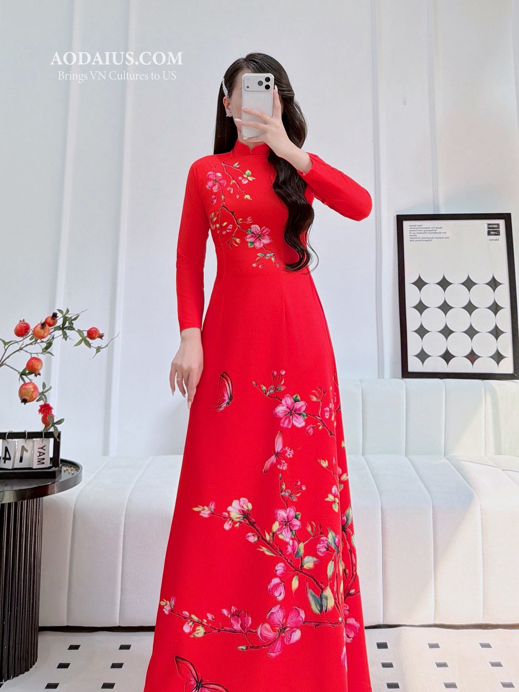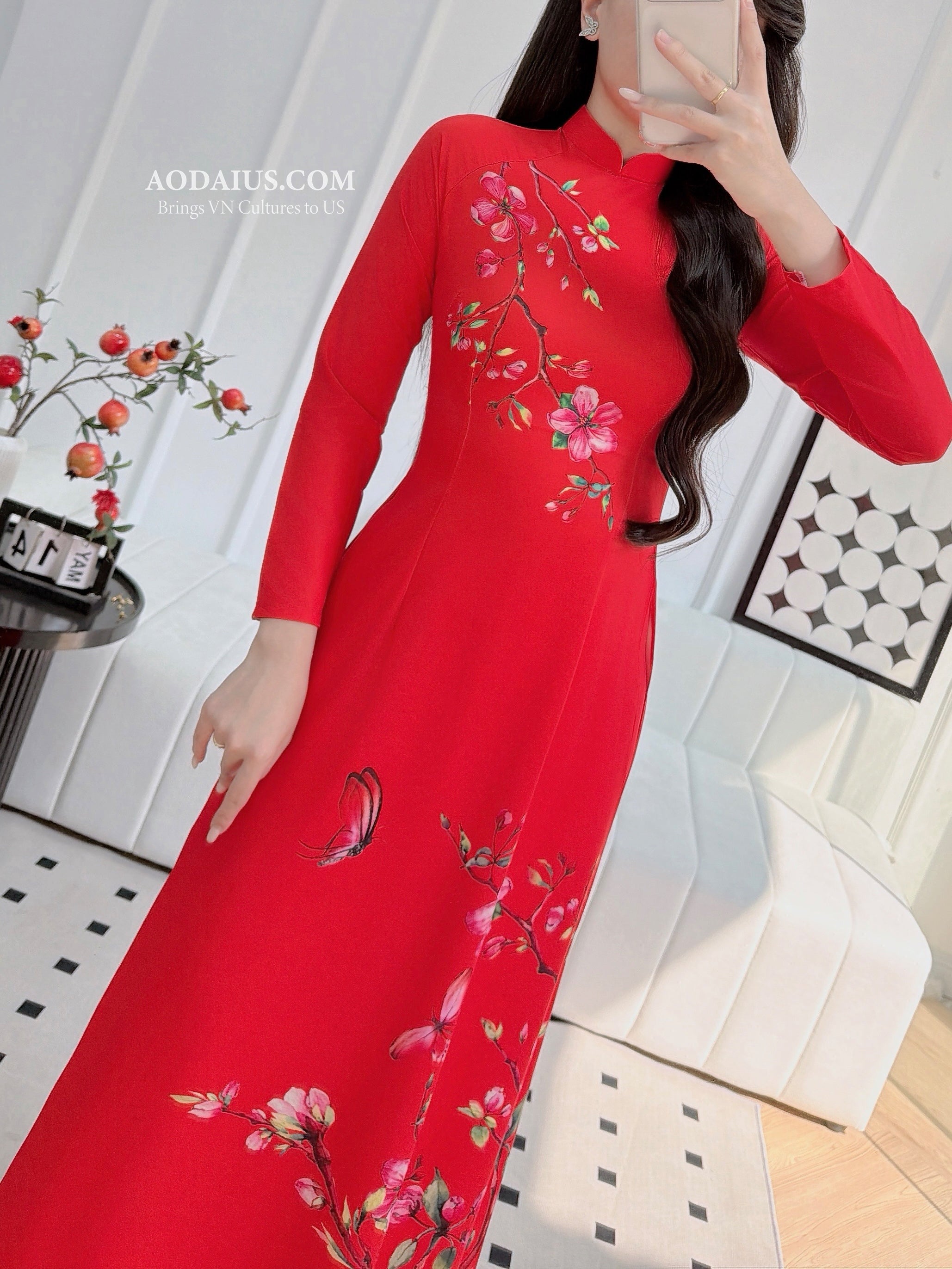 Spring Blossom Butterfly Red Vietnamese Ao Dai