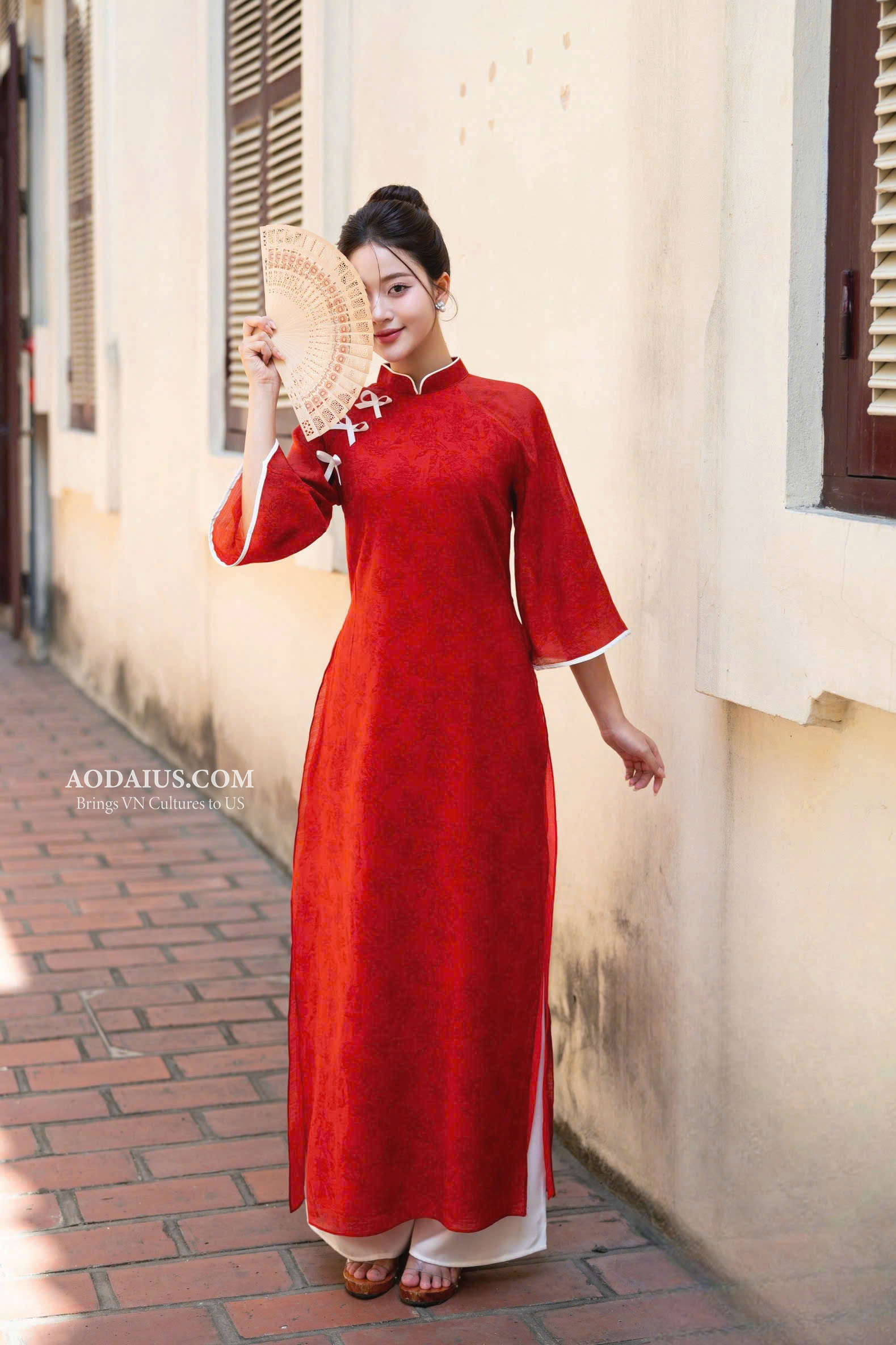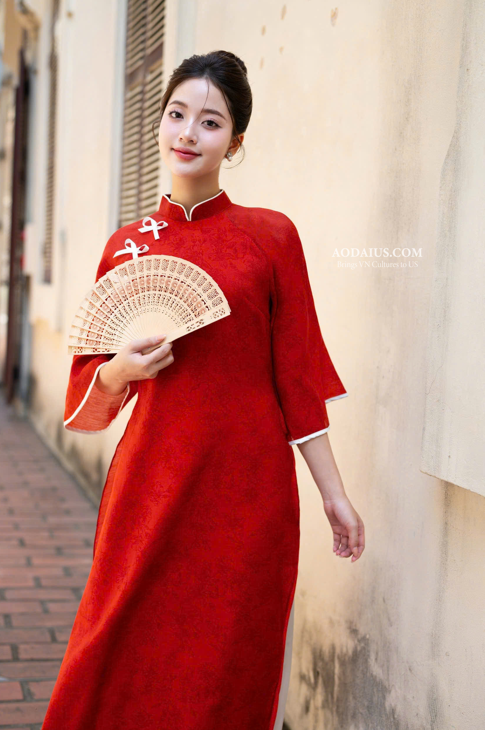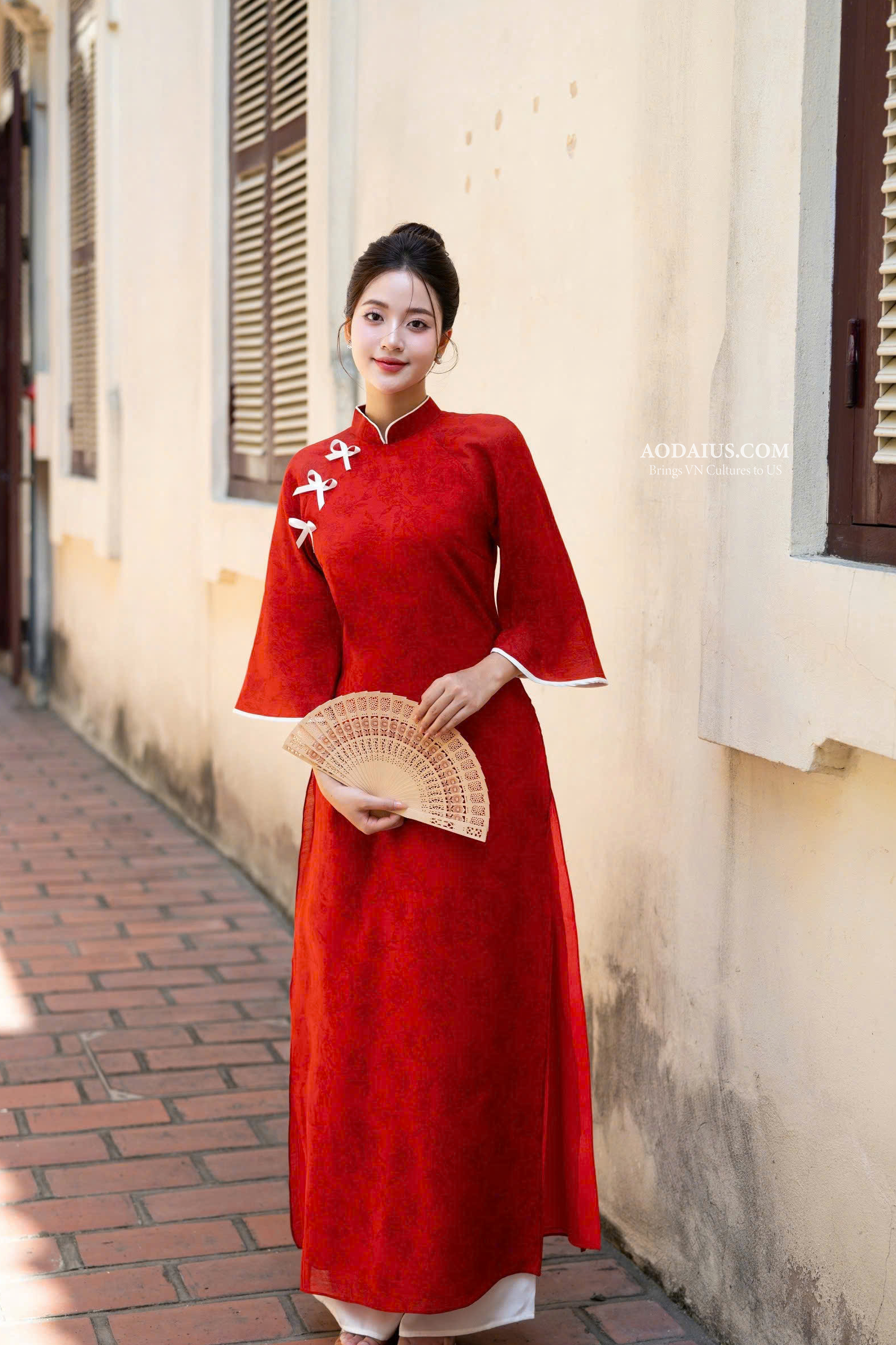 Classic, graceful, and full of Vietnamese charm-this red modern Áo Dài features a subtle tone-on-tone pattern and sweet white bow knot buttons on the shoulder for a unique, elegant touch. Perfect for Tết (Lunar New Year), family photos, weddings, engagement/tea ceremony, and Vietnamese cultural events.