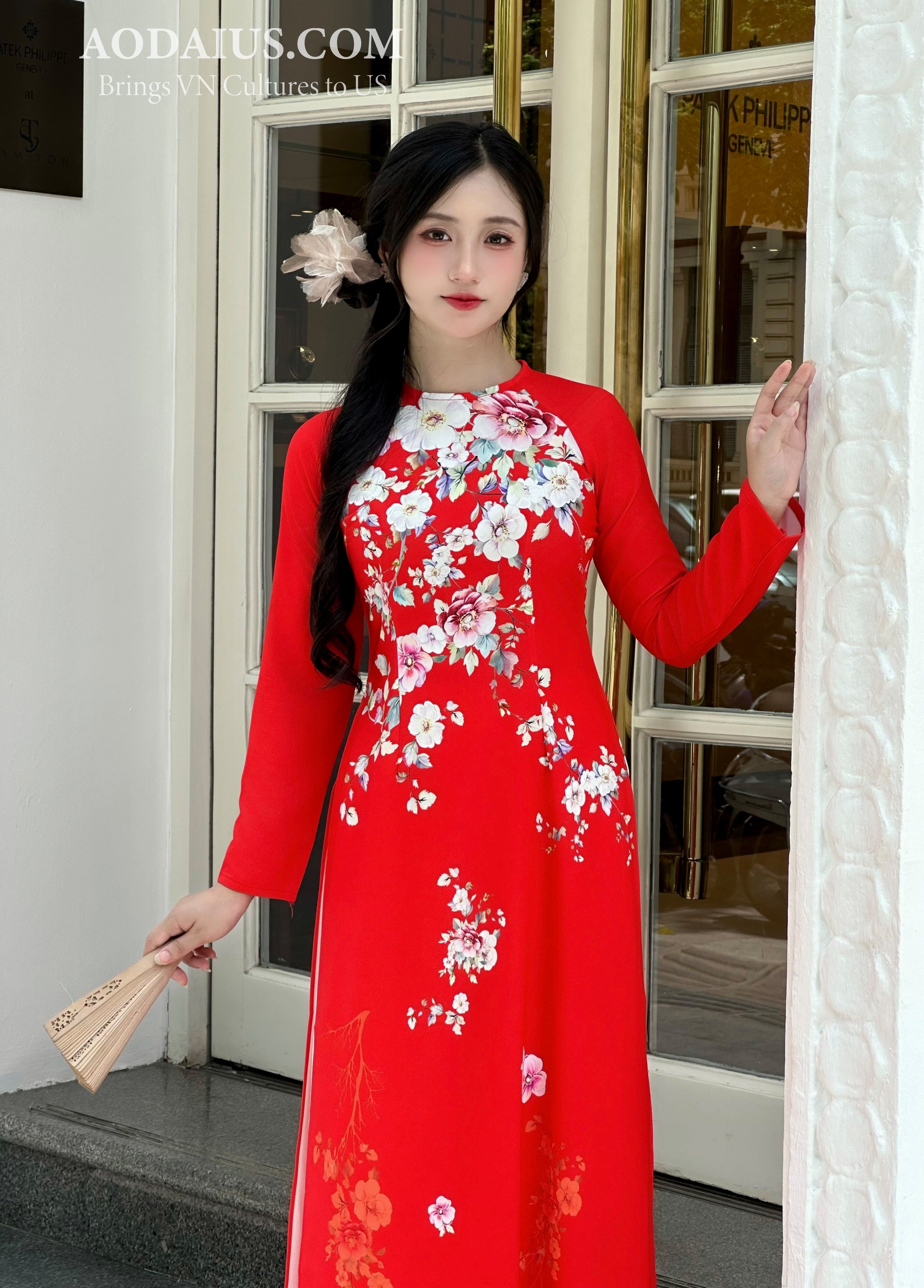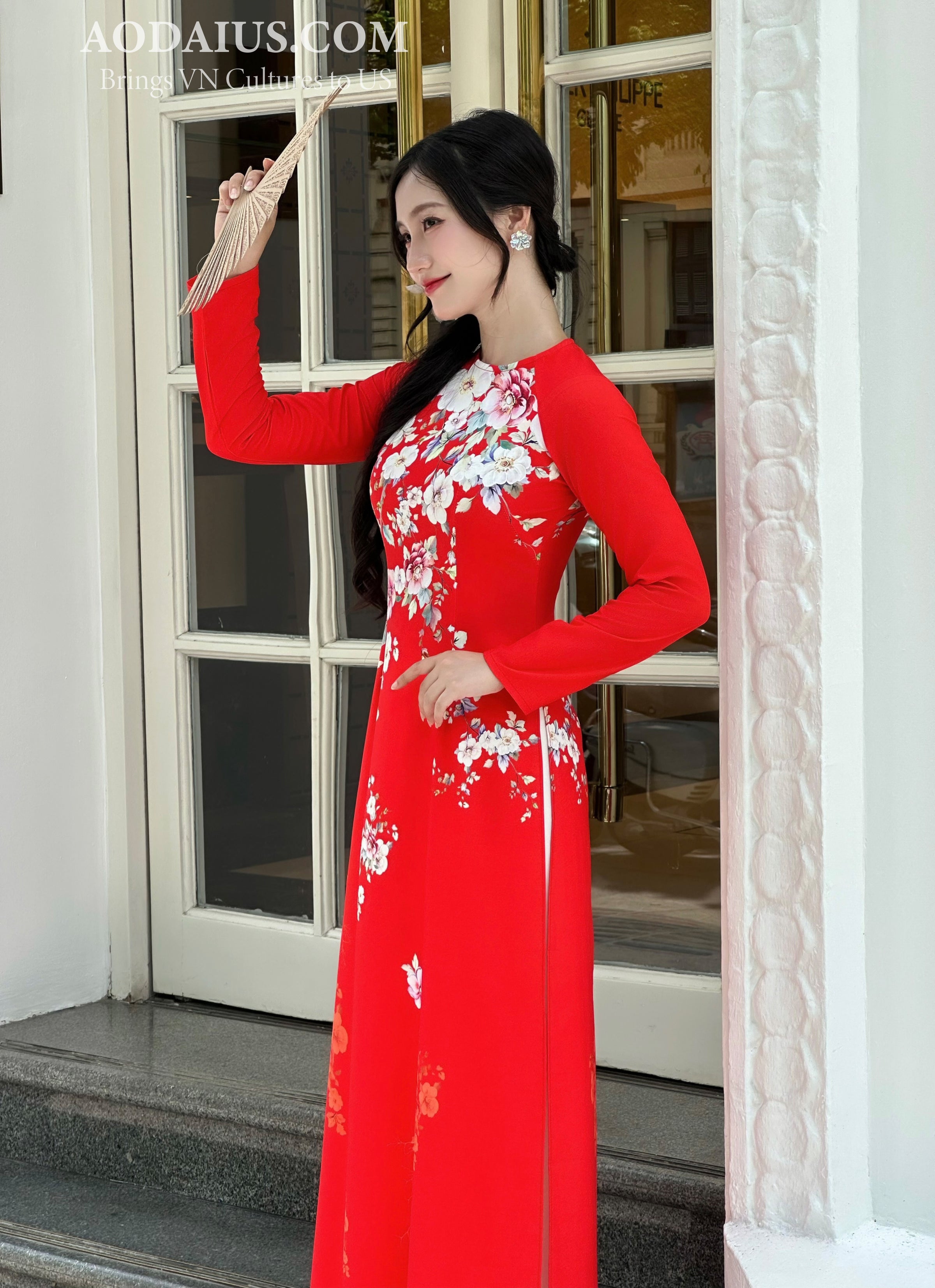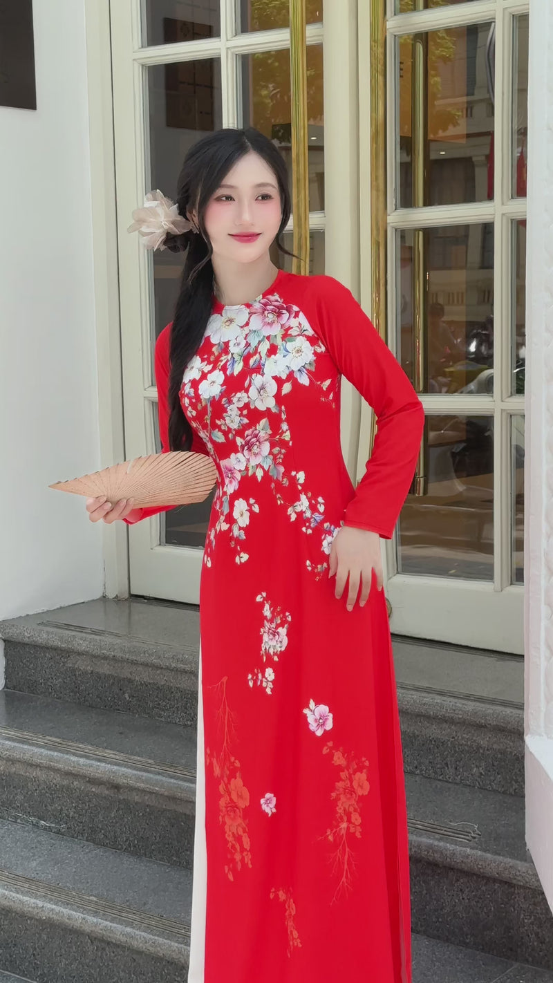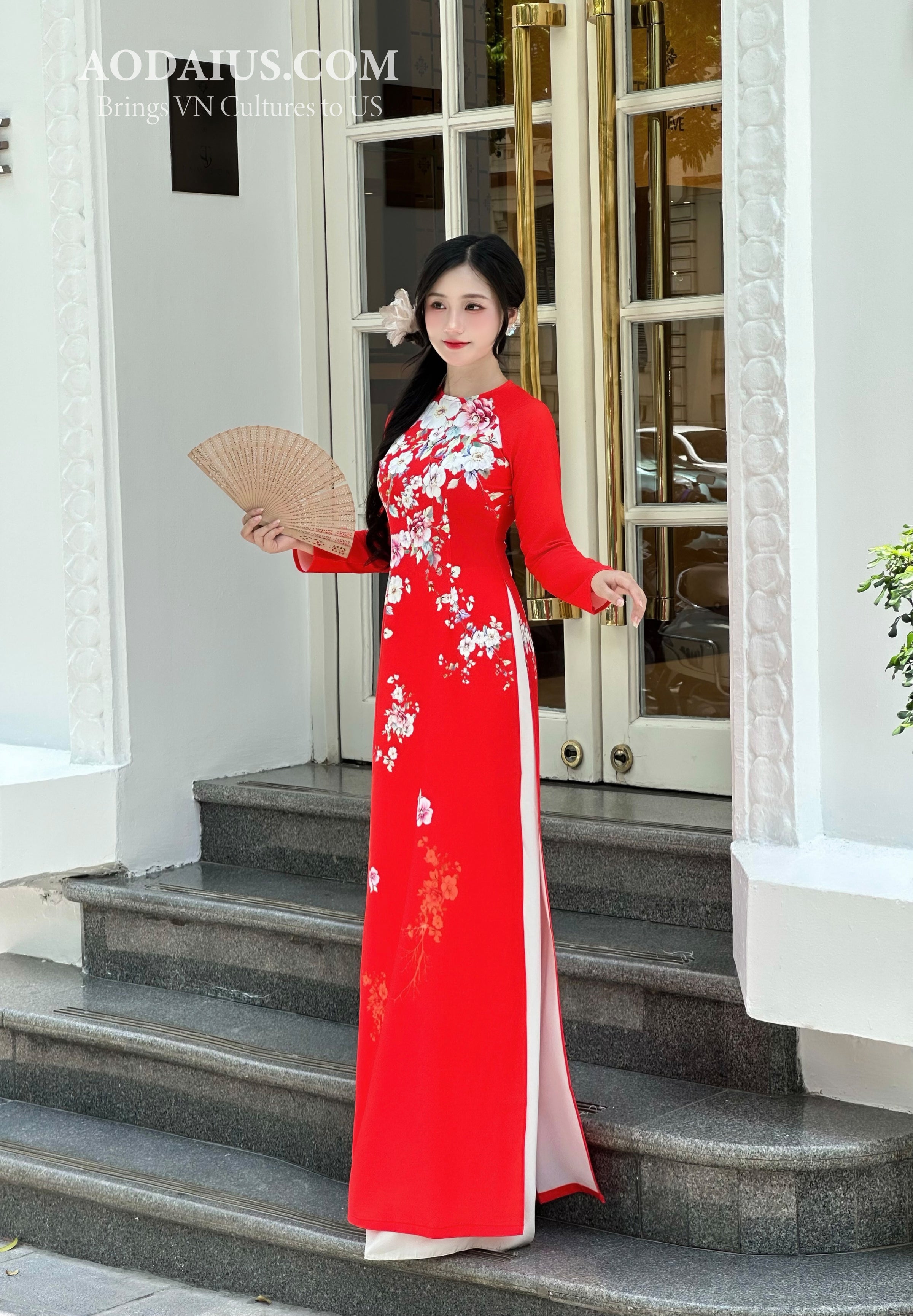 Red Spring Blossom Vietnamese Traditional Ao Dai No Pants I7