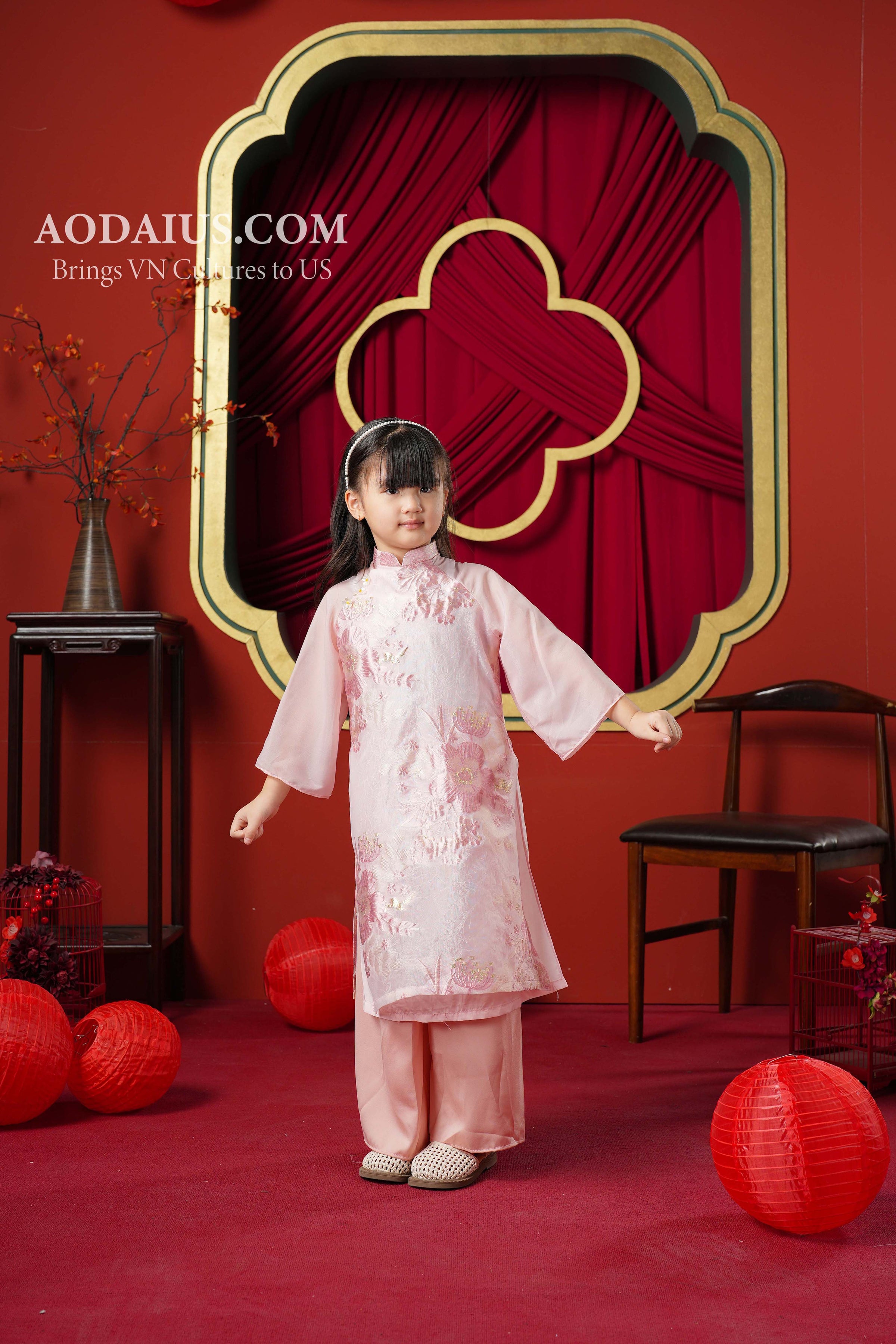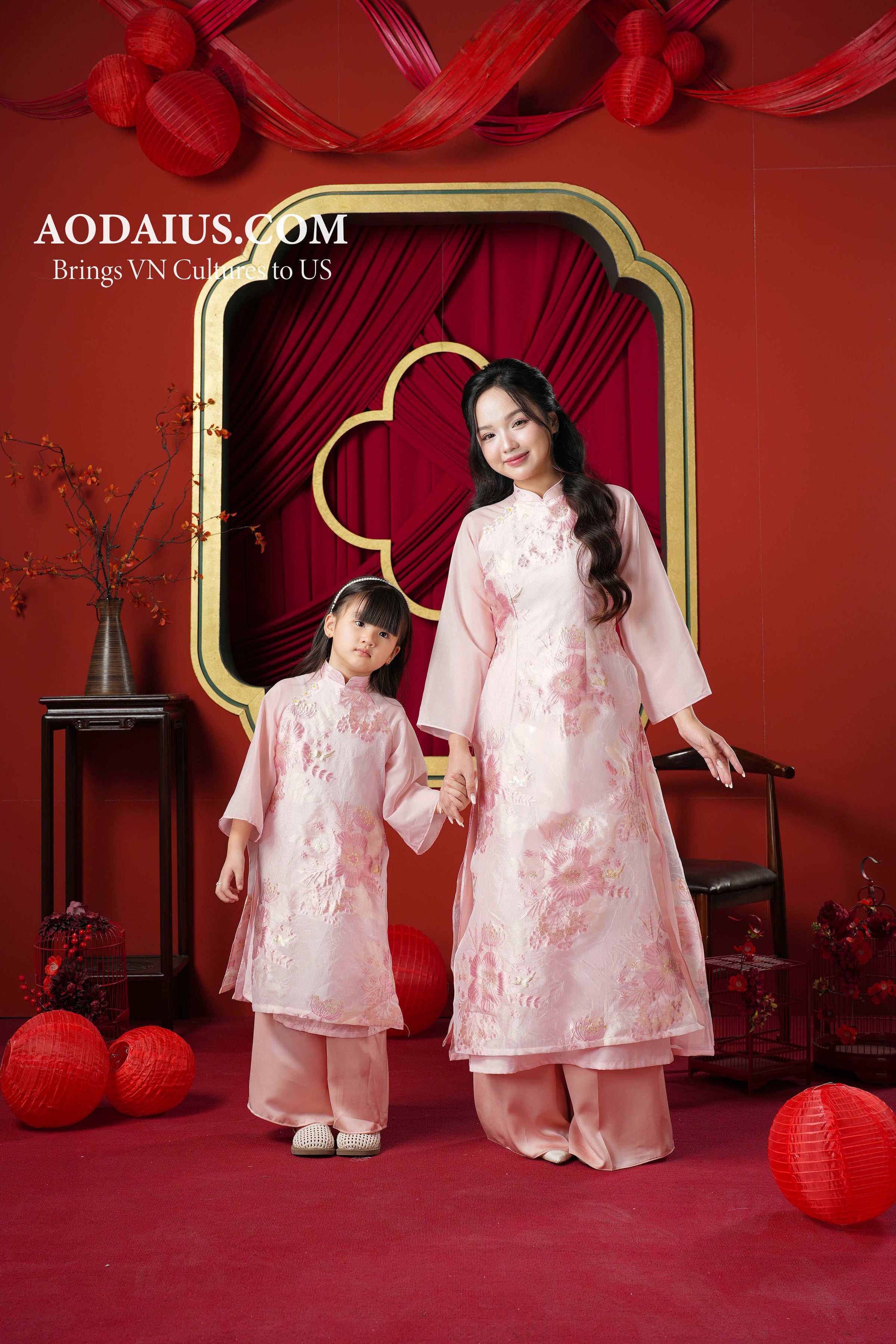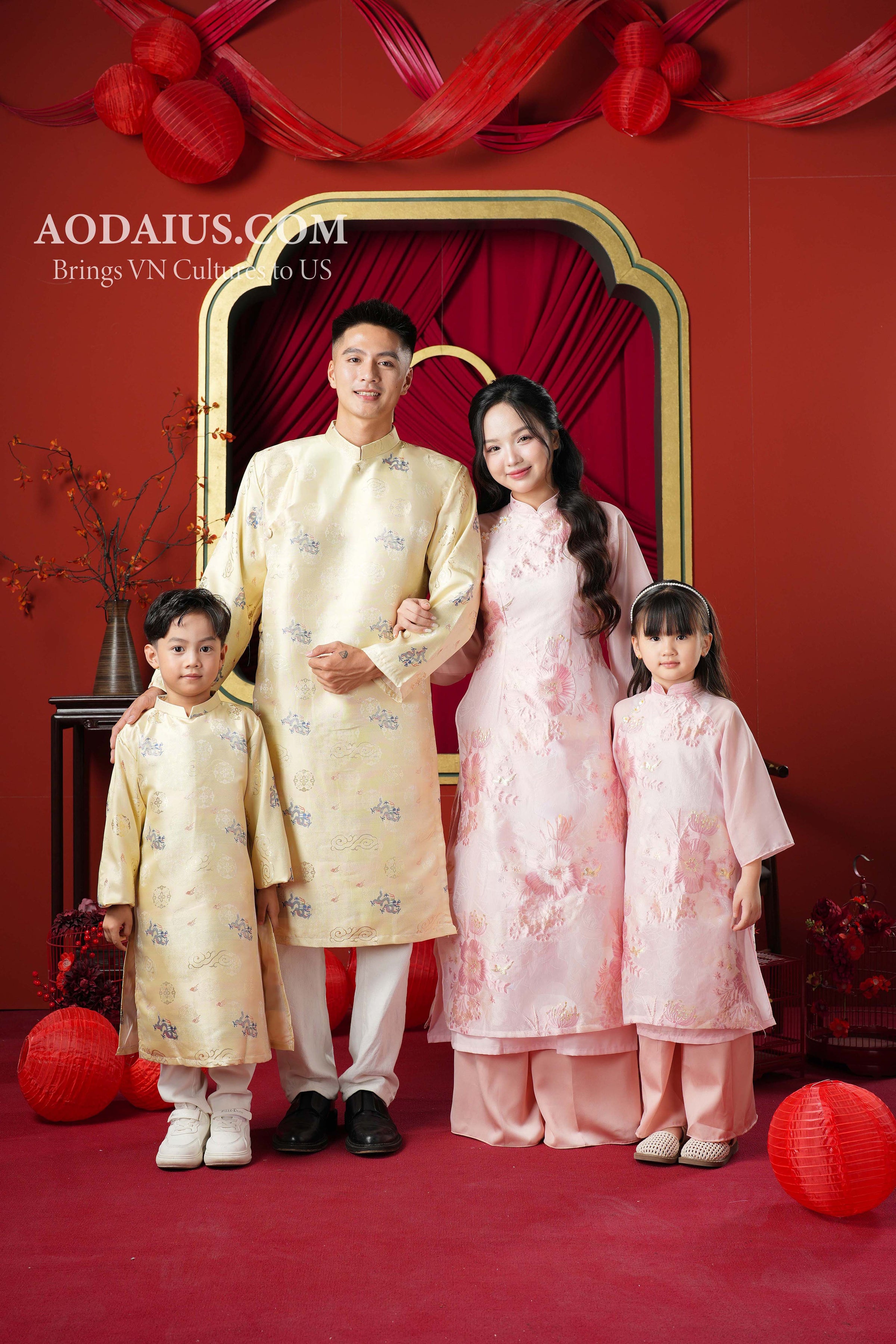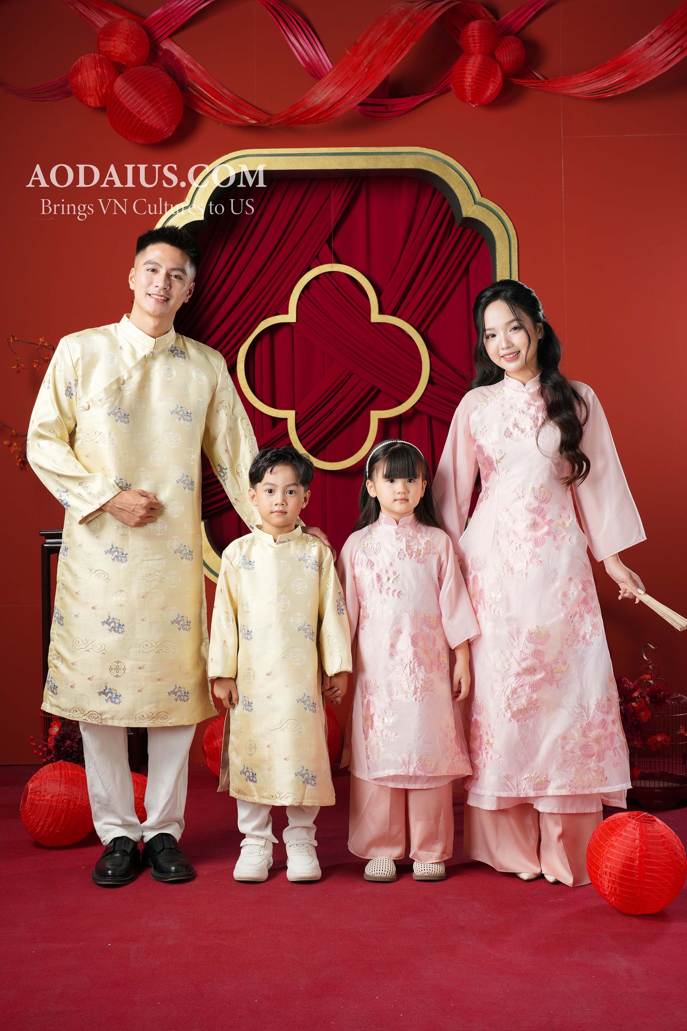Celebrate Lunar New Year in coordinated style with this elegant family áo dài set. Mom and daughter wear soft blush-pink áo dài with delicate flowers, while dad and son complement them in light champagne Taffeta with traditional Vietnamese patterns. Together, the colors create a warm, festive look that stands out beautifully in Tết photos.