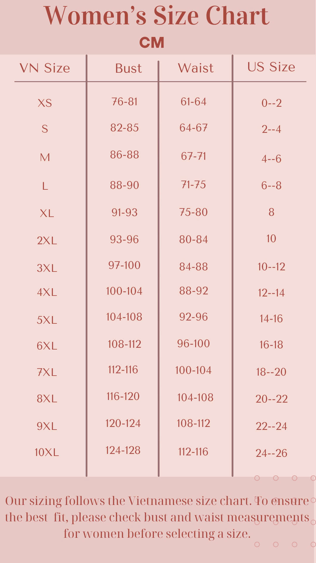 Our sizing follows the Vietnamese size chart. To ensure the best fit, please check bust and waist measurements for women, chest for men, or weight for kids before selecting a size.